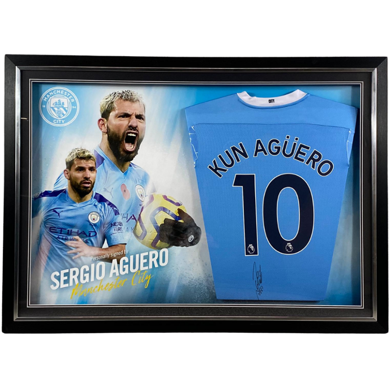A signed and authenticated Sergio Aguero Manchester City shirt, beautifully encased in a light-up presentation frame, commemorates the legendary striker's illustrious career at the club. With dimensions of approximately 31 inches in height and 43 inches in width, this framed memorabilia becomes a captivating centrepiece, honouring Aguero's remarkable contributions to Manchester City's success.