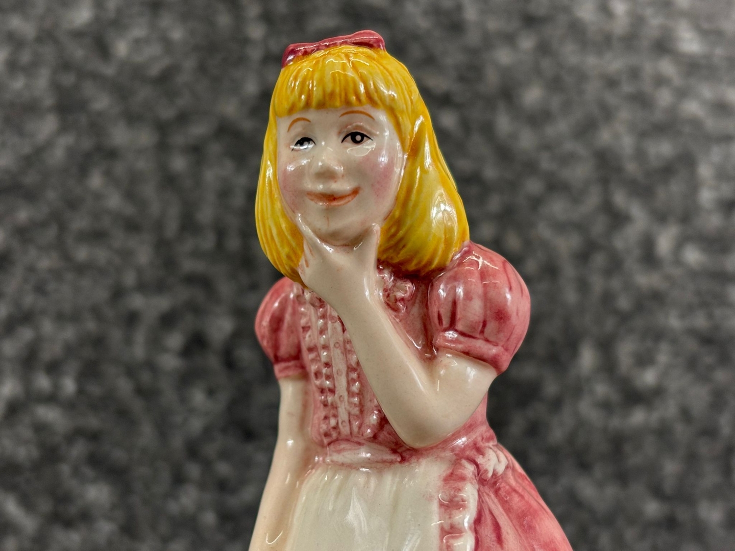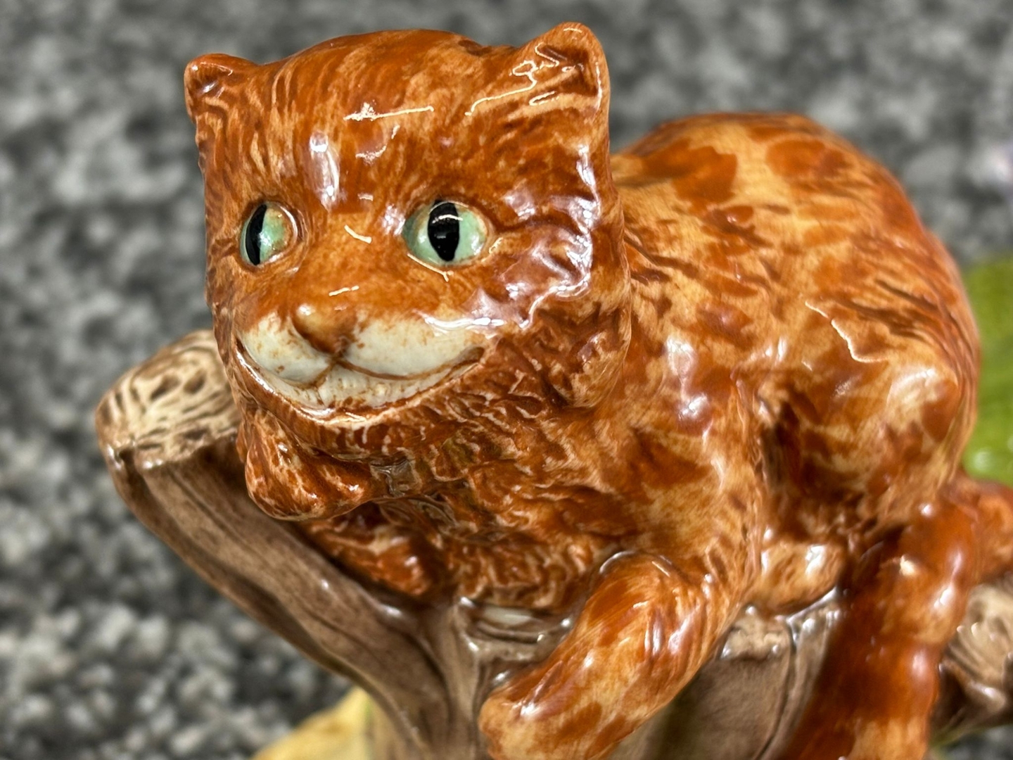 A set of 2 Beswick porcelain sculptures captures the magic and whimsy of Alice’s Adventures in Wonderland with exceptional charm. Featuring the curious Alice and the ever-enigmatic Cheshire Cat, each figure is beautifully hand-painted and sculpted to reflect the playful spirit of Lewis Carroll’s timeless tale. Alice stands thoughtfully, dressed in her iconic pink dress and white apron, while the Cheshire Cat reclines mischievously on a tree stump, grinning with knowing amusement.