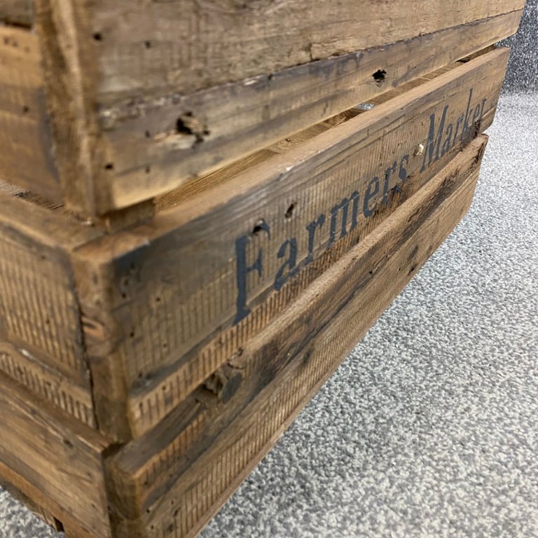 A set of three flower & grocery style french storage boxes. Approx 32" height, 22" width, 15" depth.