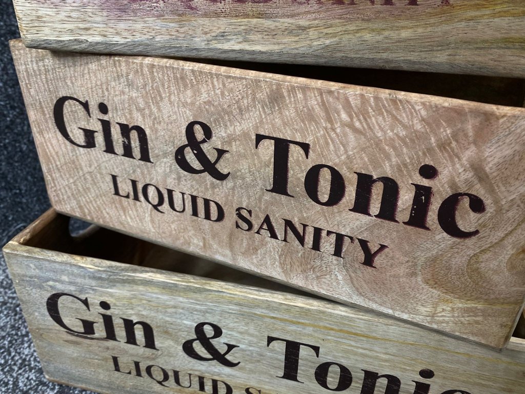 A set of five 'Its Always Gin & Tonic Liquid Sanity' storage boxes. Approx 25" height, 14" width, 9" depth.