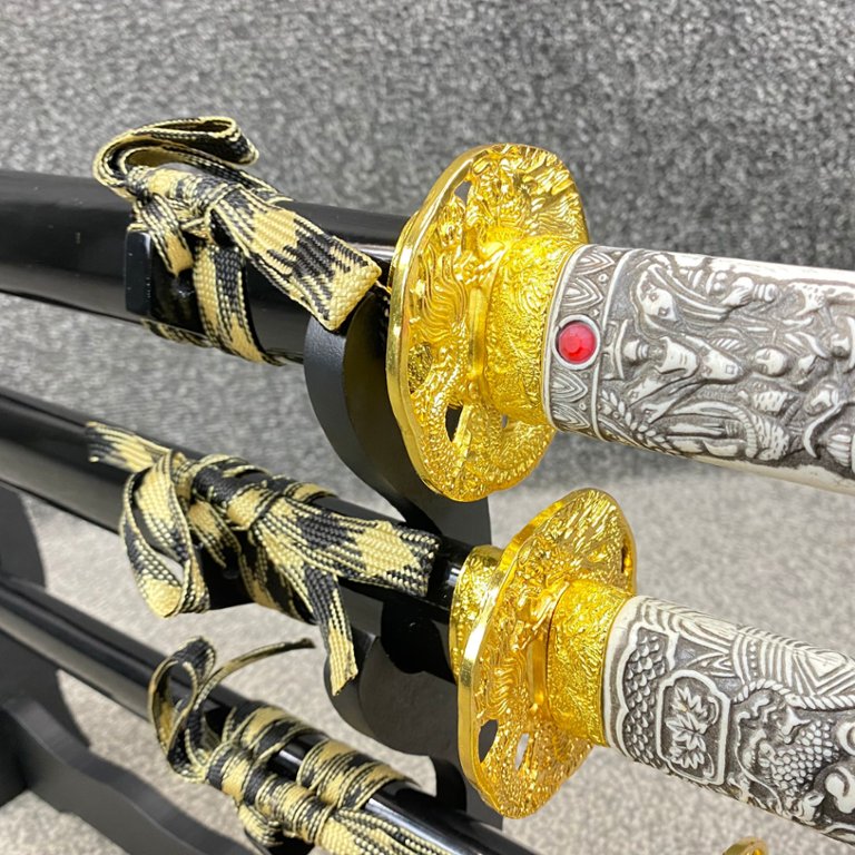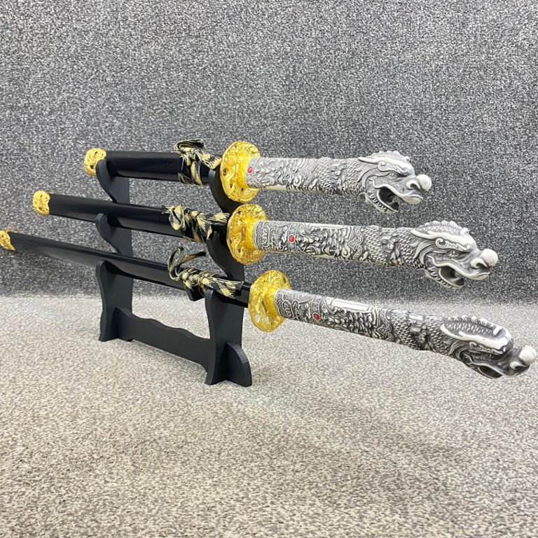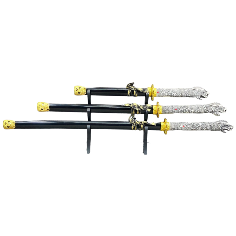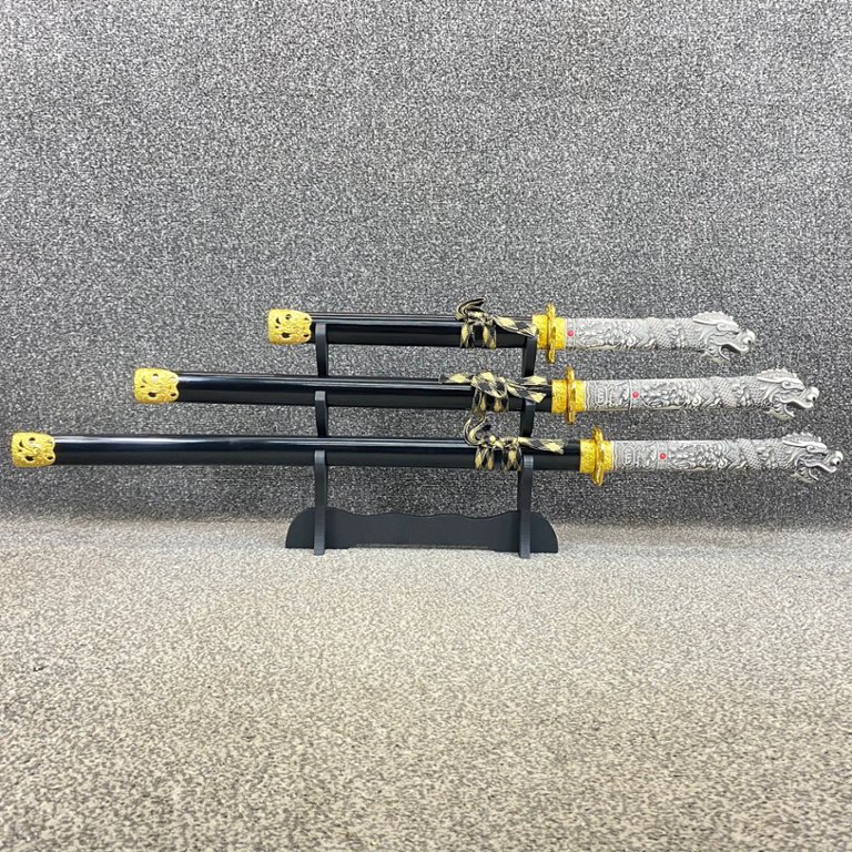 Each sword in this set features a striking black dragon-themed handle, symbolizing strength, wisdom, and courage. The intricate dragon motifs adorning the handles are meticulously sculpted to evoke the majestic presence of these mythical creatures.