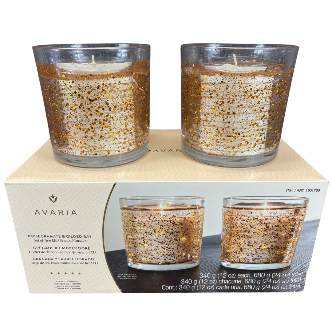 A set of 2 Avaria Sparkling LED Candles - Pomegranate & Gilded Bay. 2 x 340g