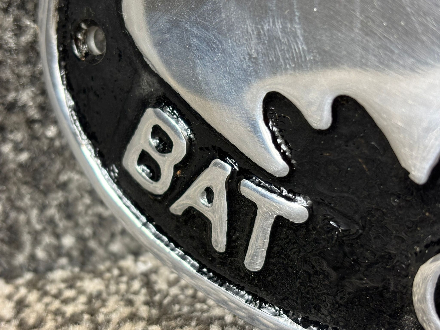 A silver and black metal Bat Cave wall plaque. Approximately 10cm height, 16cm width.
