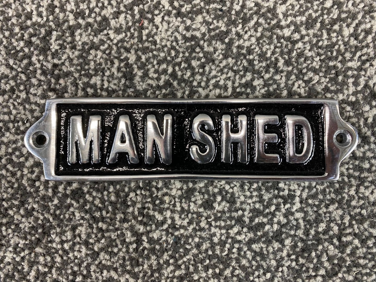 A silver and black metal Man Shed wall plaque. Approx 2" height, 6" width.