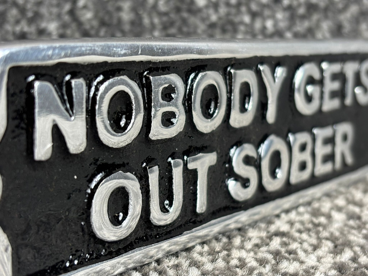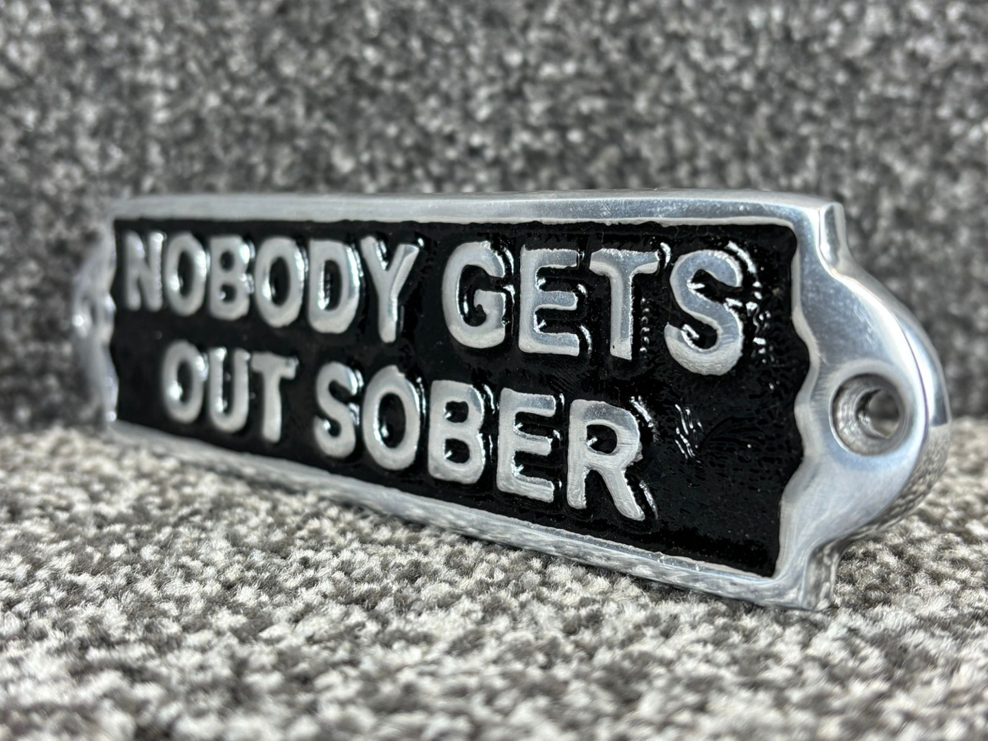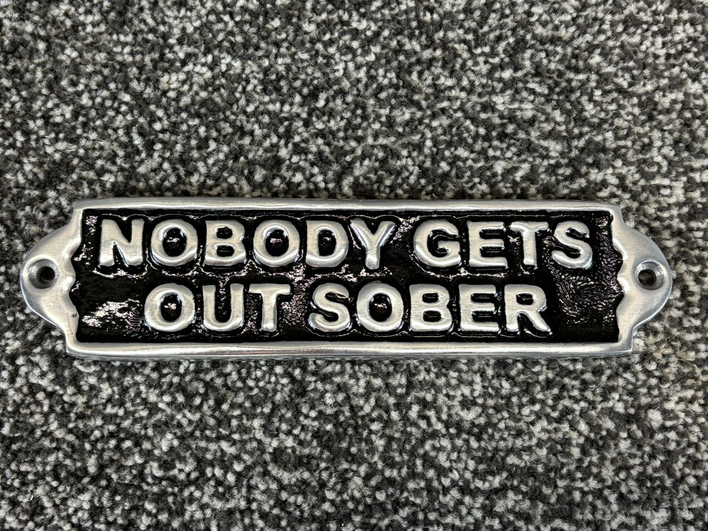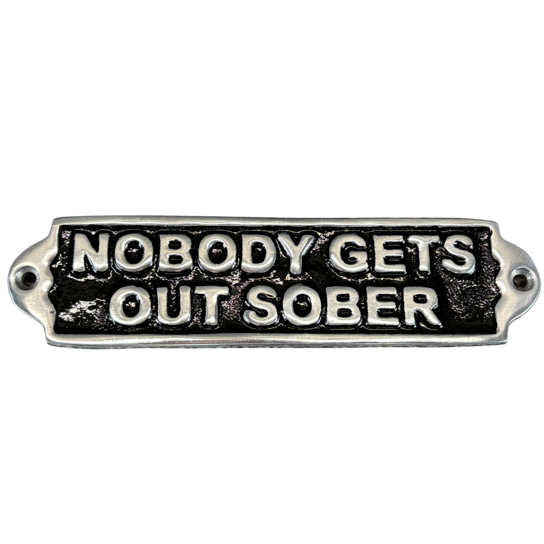 A silver and black metal Nobody Gets Out Sober wall plaque. Approximately 5cm height, 19cm width.