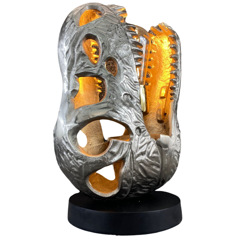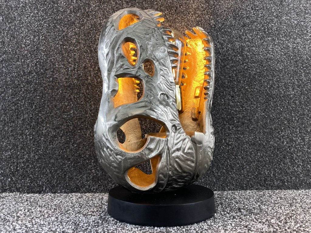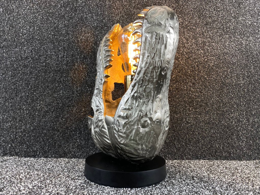 A silver Dinosaur Head Lamp on a black base. Approx 14" height, 10" width, 6" depth.