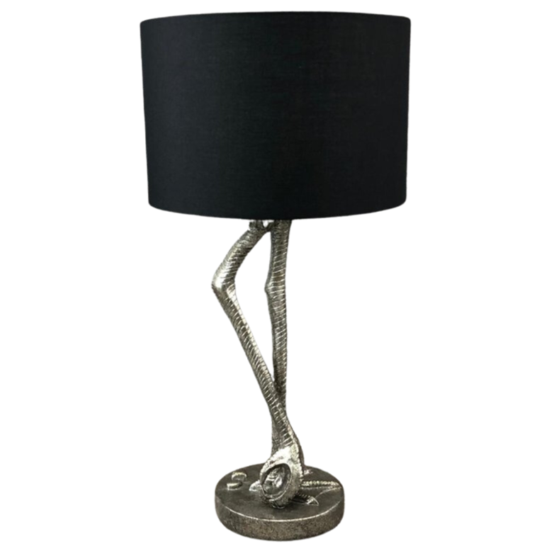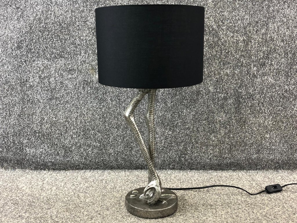 A silver Flamingo style table top lamp with black shade. Approx 24" height, 12" width.