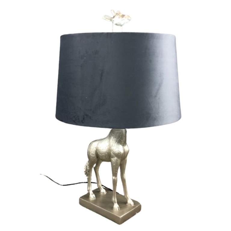 A silver Giraffe style table top lamp with a grey velvet shade. Approx 26" height, 16" width.
