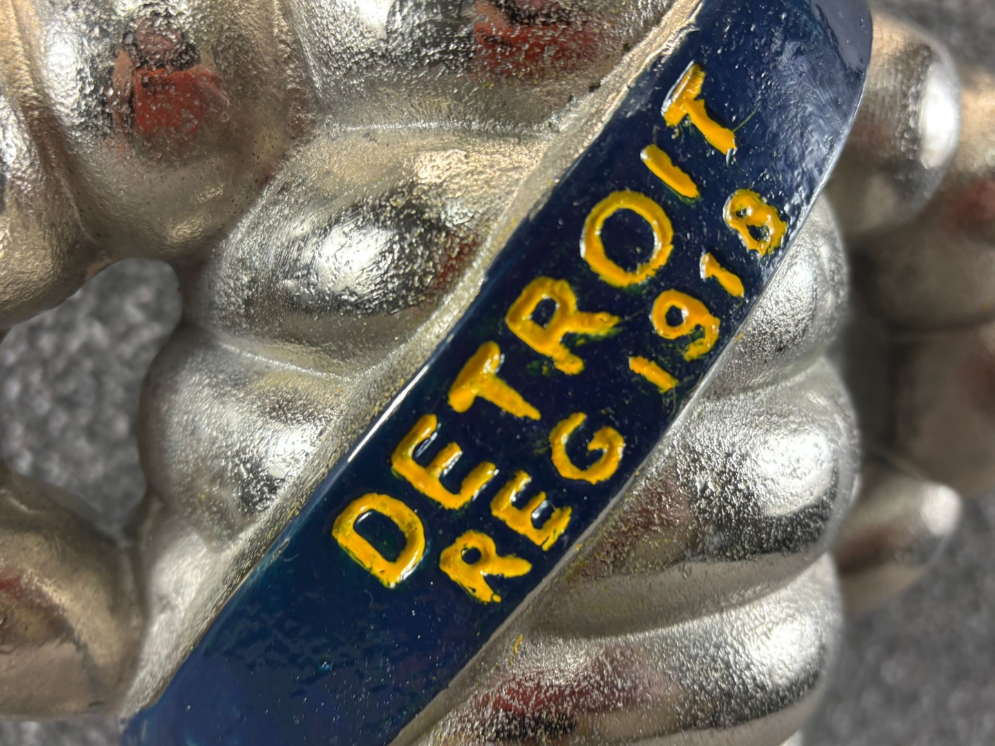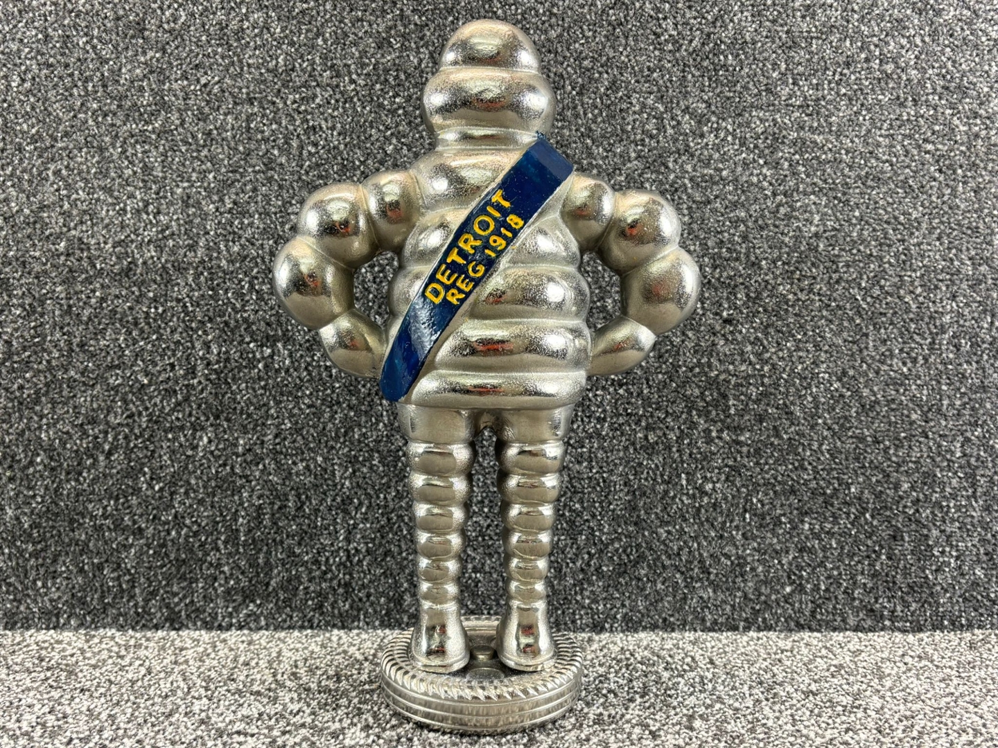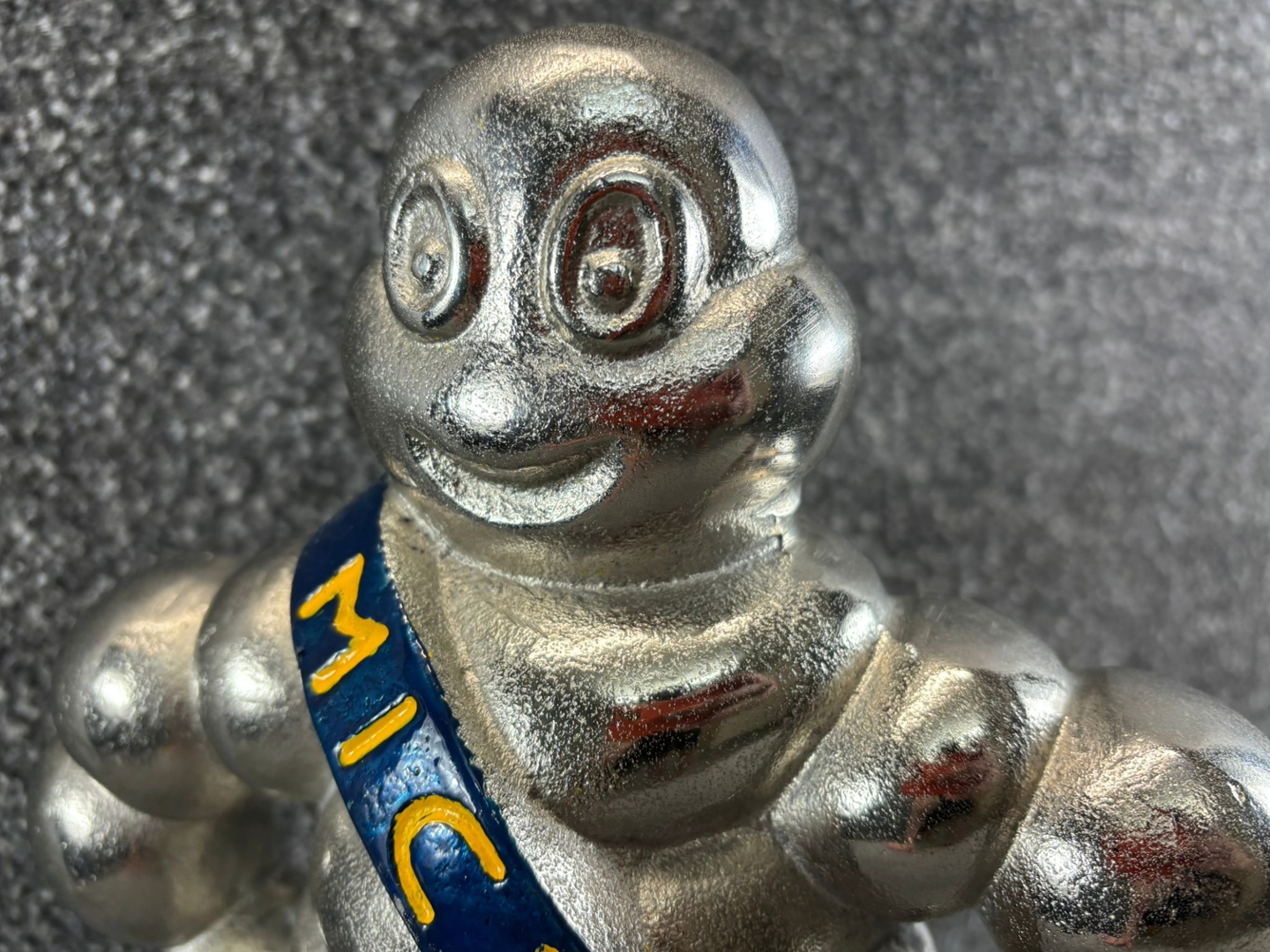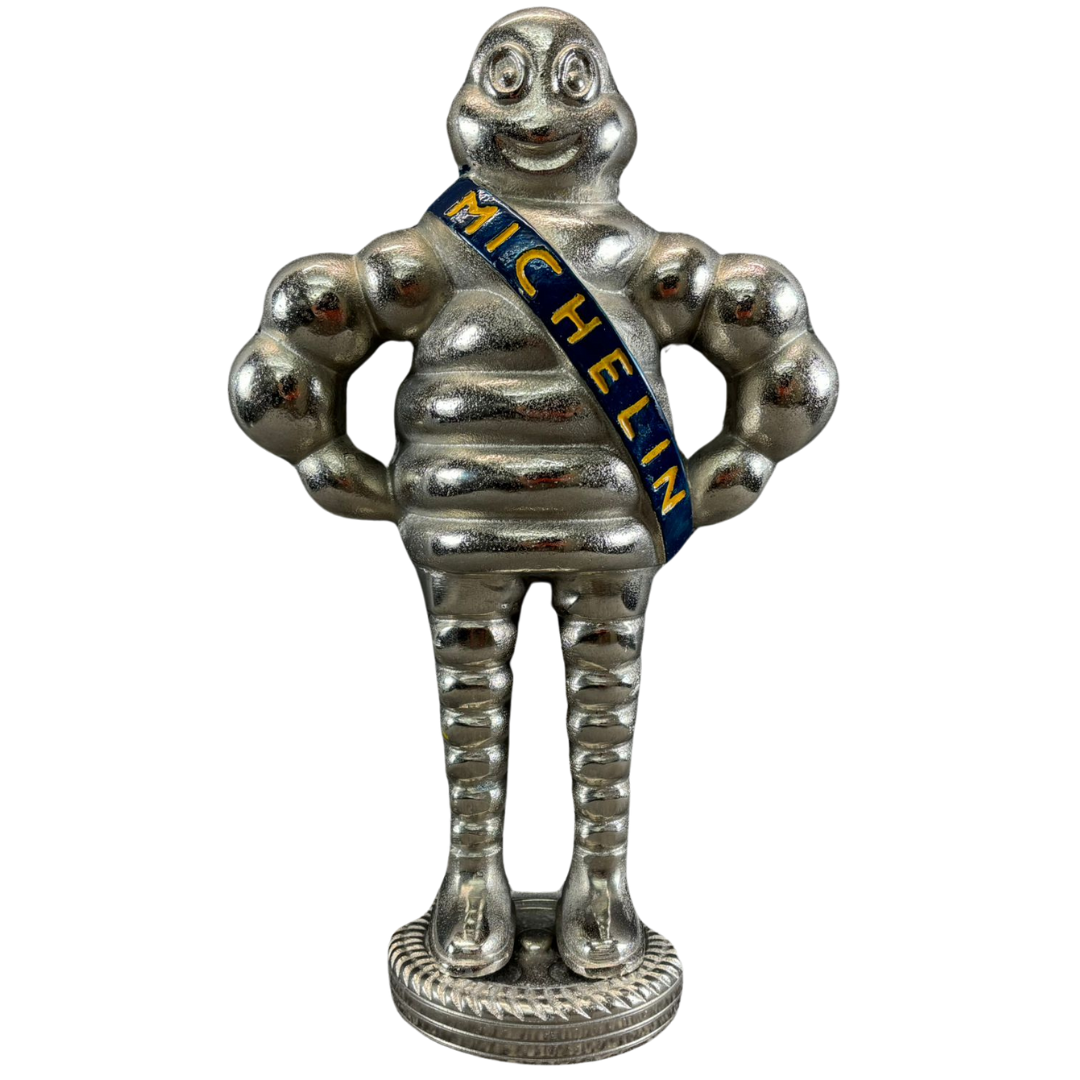 Crafted in a lustrous silver finish with a vibrant blue and yellow "MICHELIN" sash, the sculpture radiates vintage flair and collector appeal. The tyre base adds a distinctive touch, grounding the piece in its automotive roots and making it perfect for display in a garage, showroom, or office. Whether you're a car enthusiast, memorabilia collector, or simply a fan of iconic design, this Michelin Man is a standout decorative treasure full of nostalgic charm.