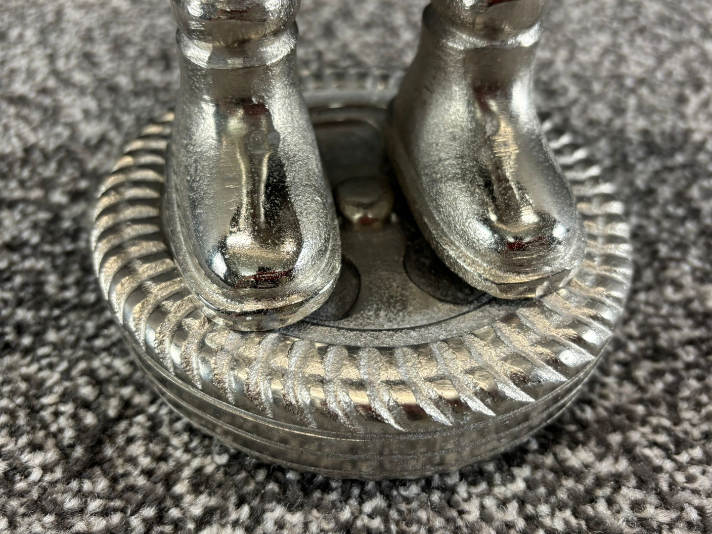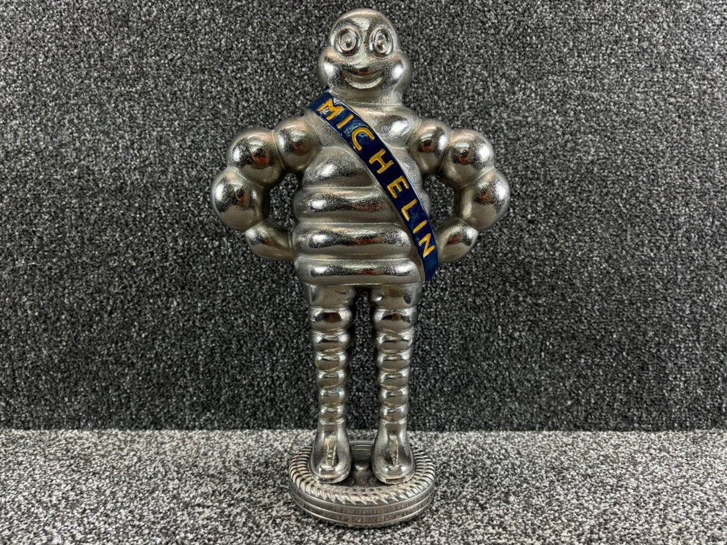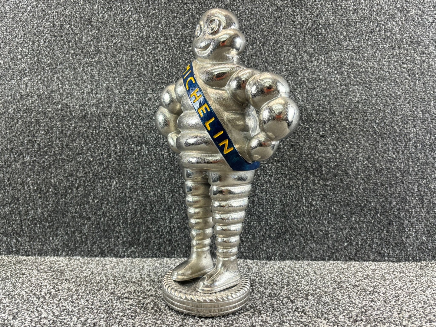 A silver Michelin Man sculpture, proudly standing atop a tyre base. Measuring approximately 37cm in height, 22cm in width, and 12cm in depth, this eye-catching piece captures the charm and character of "Bibendum," the beloved mascot of the Michelin brand. With his hands confidently planted on his hips and a joyful grin on his face, this gleaming figure embodies over a century of automotive excellence and advertising heritage.