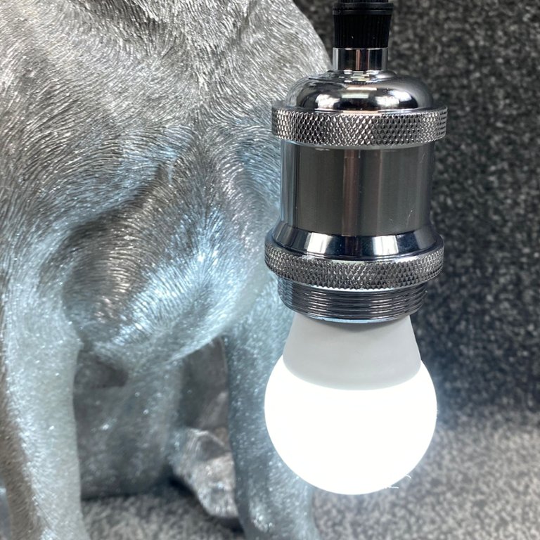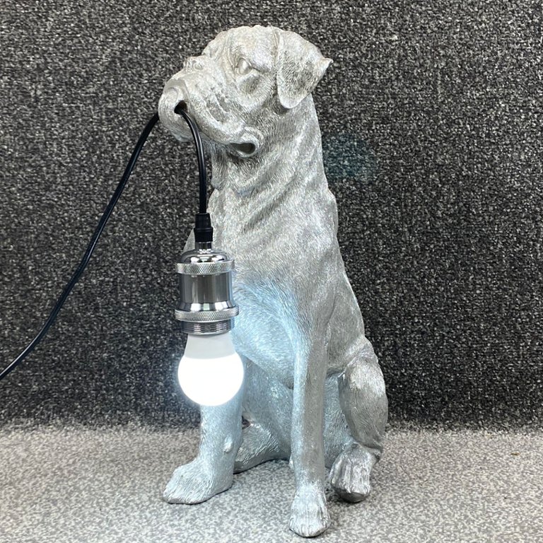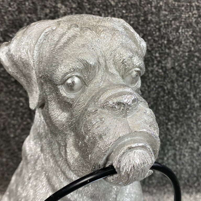 Crafted with exquisite attention to detail, the lamp features a silver-finished boxer dog figurine seated regally on a sturdy base. The lifelike representation of the boxer's gentle demeanor and distinctive features adds a touch of whimsy and personality to your decor.