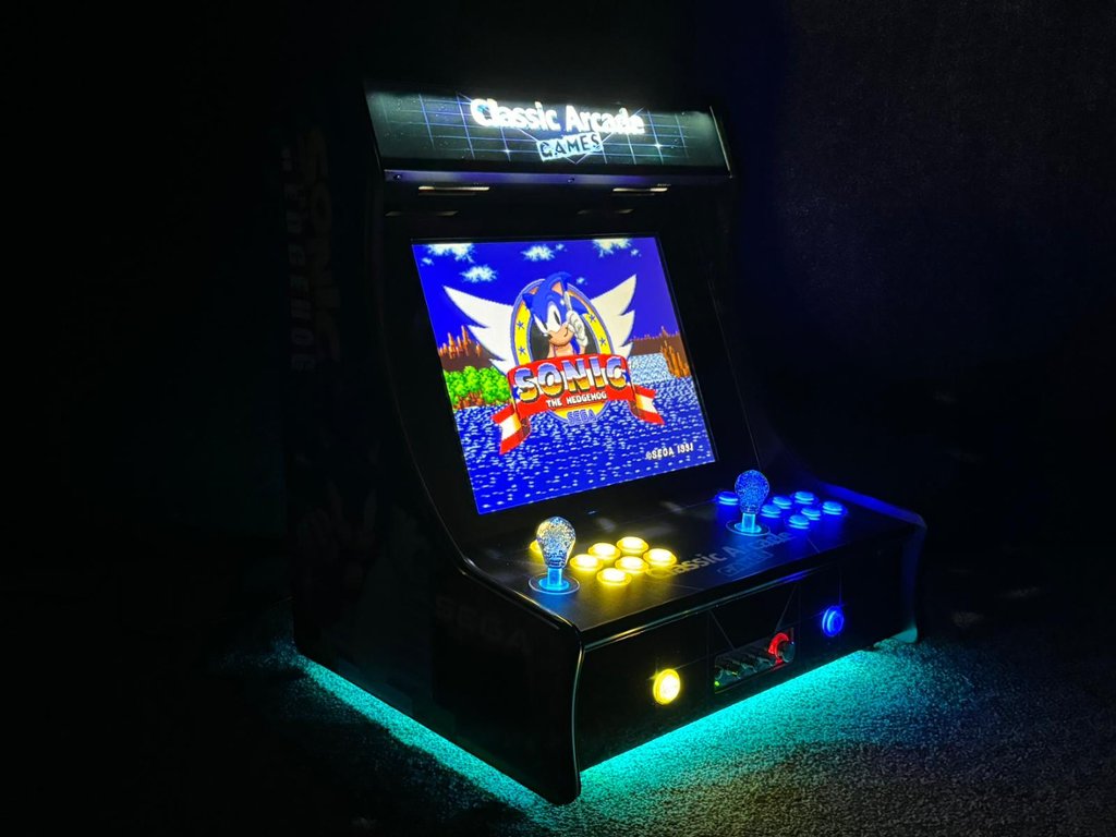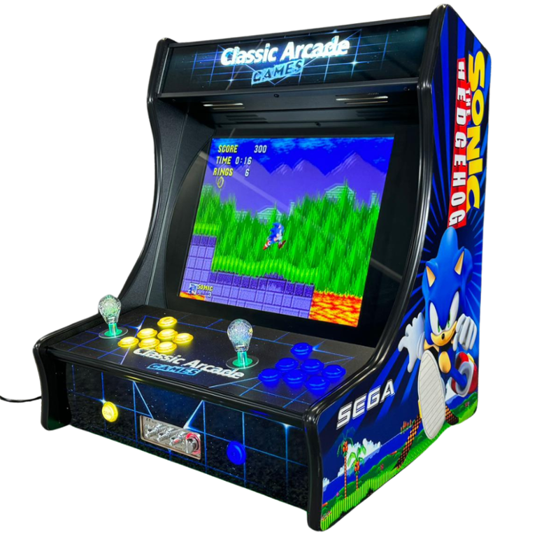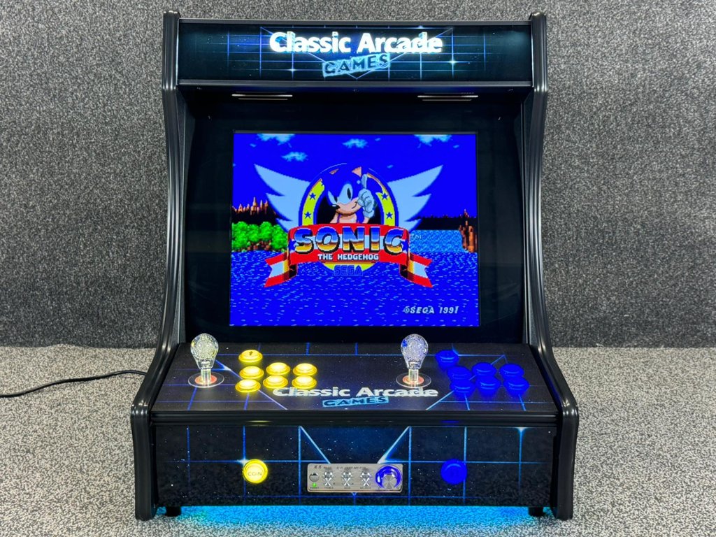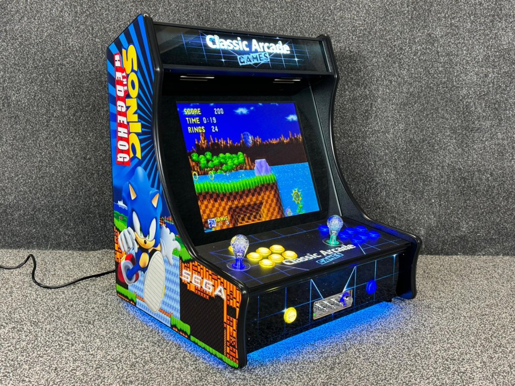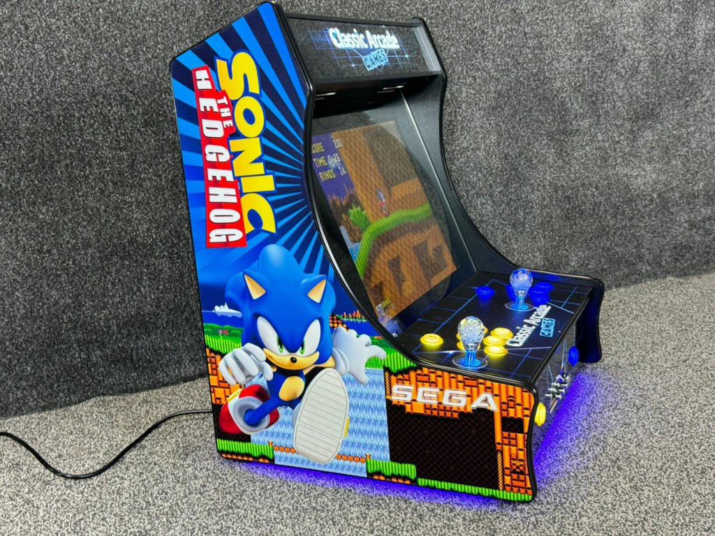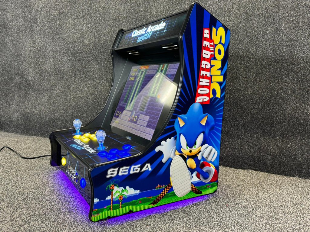 A Sonic The Hedgehog Two Player Multi Game Table Top Arcade Machine! Featuring an extensive library of 10,005 games, this arcade machine is a must-have for fans of Sonic and classic gaming alike.