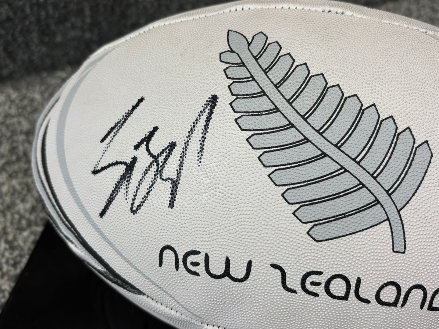 The ball features a clean white design with bold New Zealand branding and the iconic silver fern emblem prominently displayed. Williams’ signature is clearly visible on the surface, standing out against the light background and adding authenticity to the piece. The overall presentation is both striking and refined, reflecting the prestige associated with New Zealand rugby and one of its standout players.