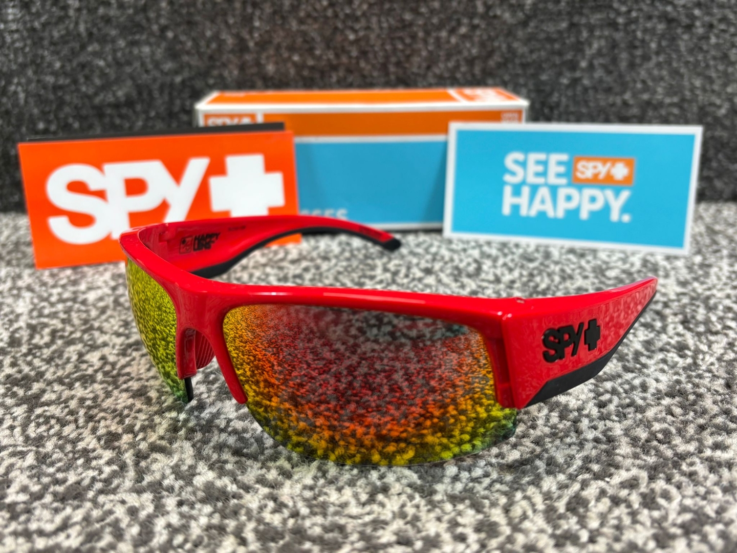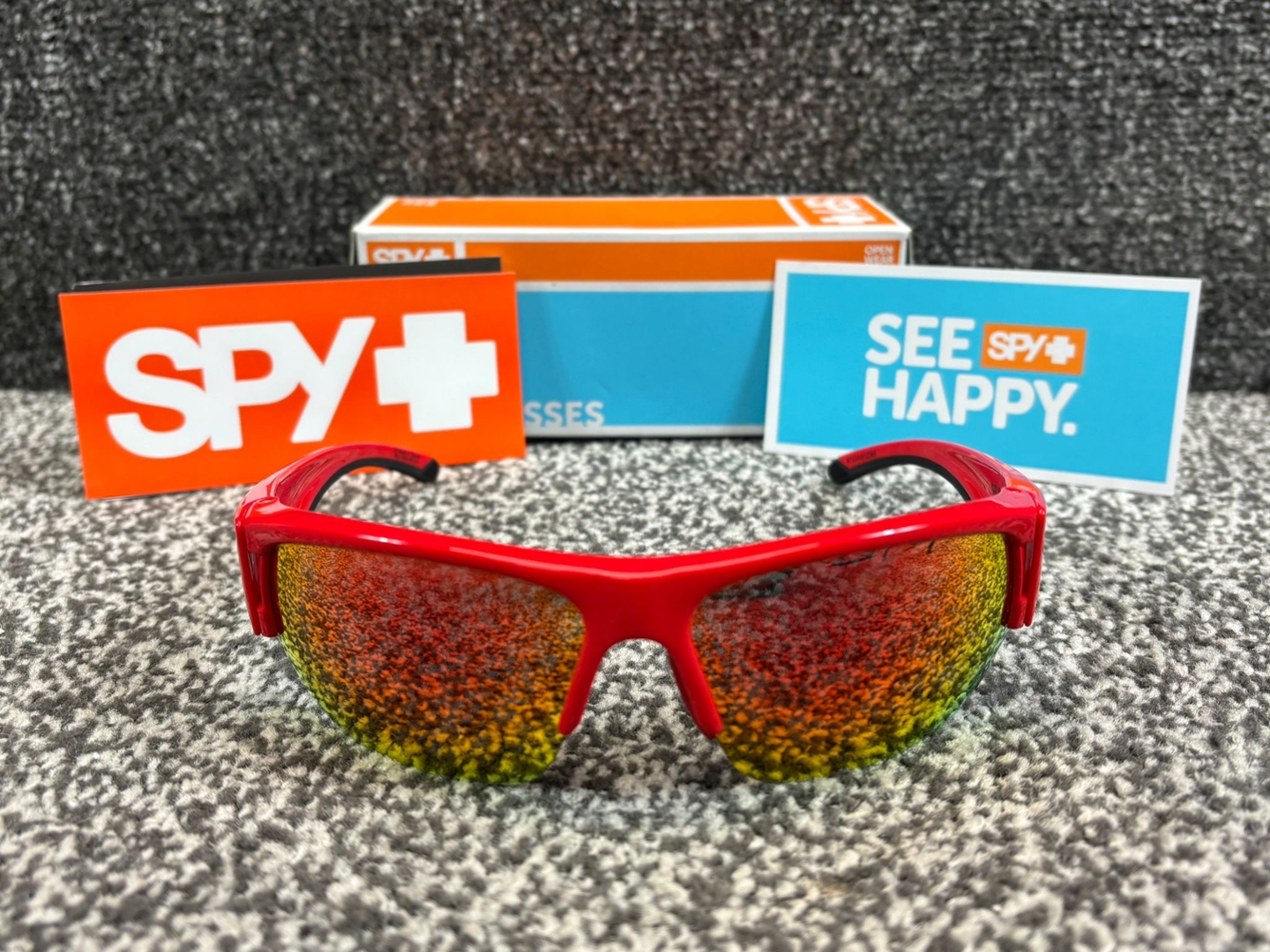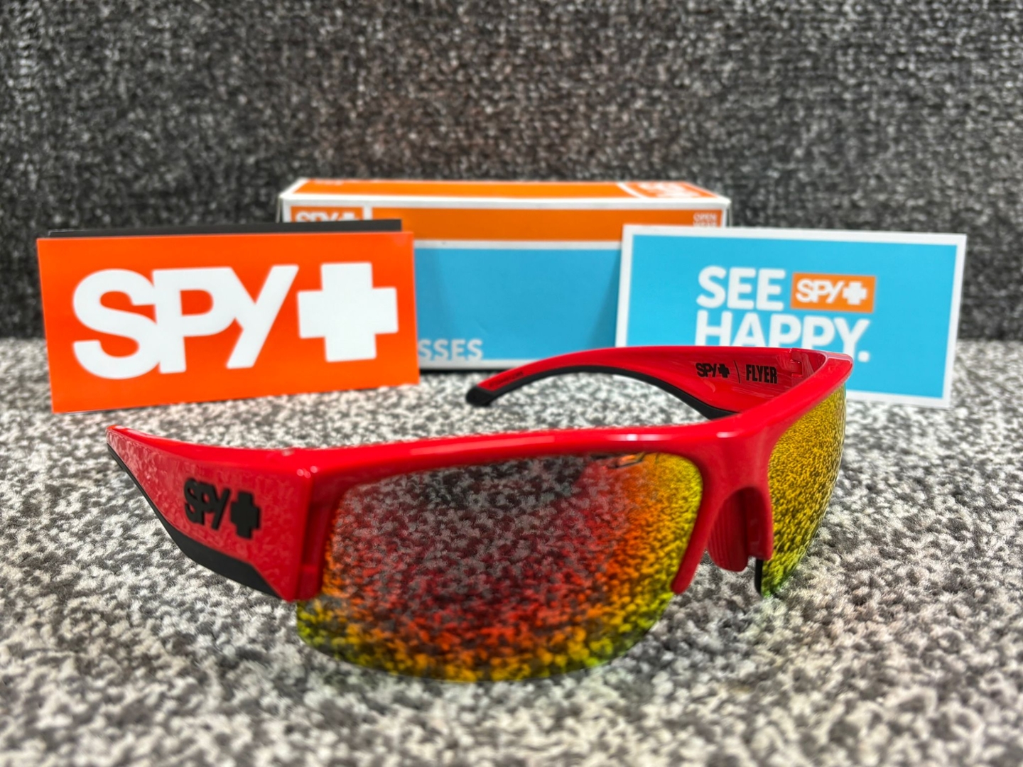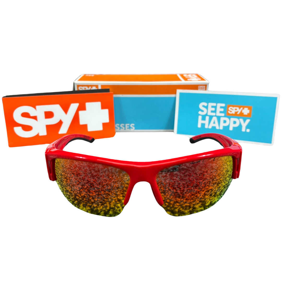 A brand new, unused, and boxed Spy+ Flyer Sunglasses in bold Red. Built for speed, comfort, and style, these dynamic shades feature a striking red frame paired with fiery mirrored lenses that deliver next-level visual clarity and serious attitude.