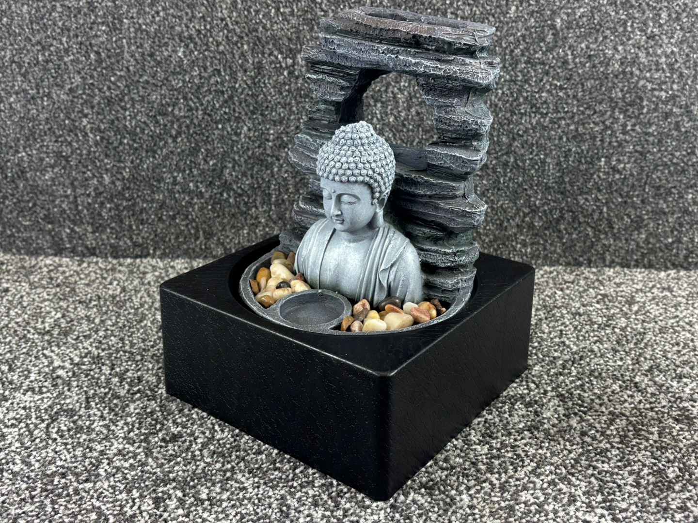 A Stone Buddha Water Fountain. Suitable for indoor and outdoor use. Approx 24cm height, 18cm width, 18cm depth.