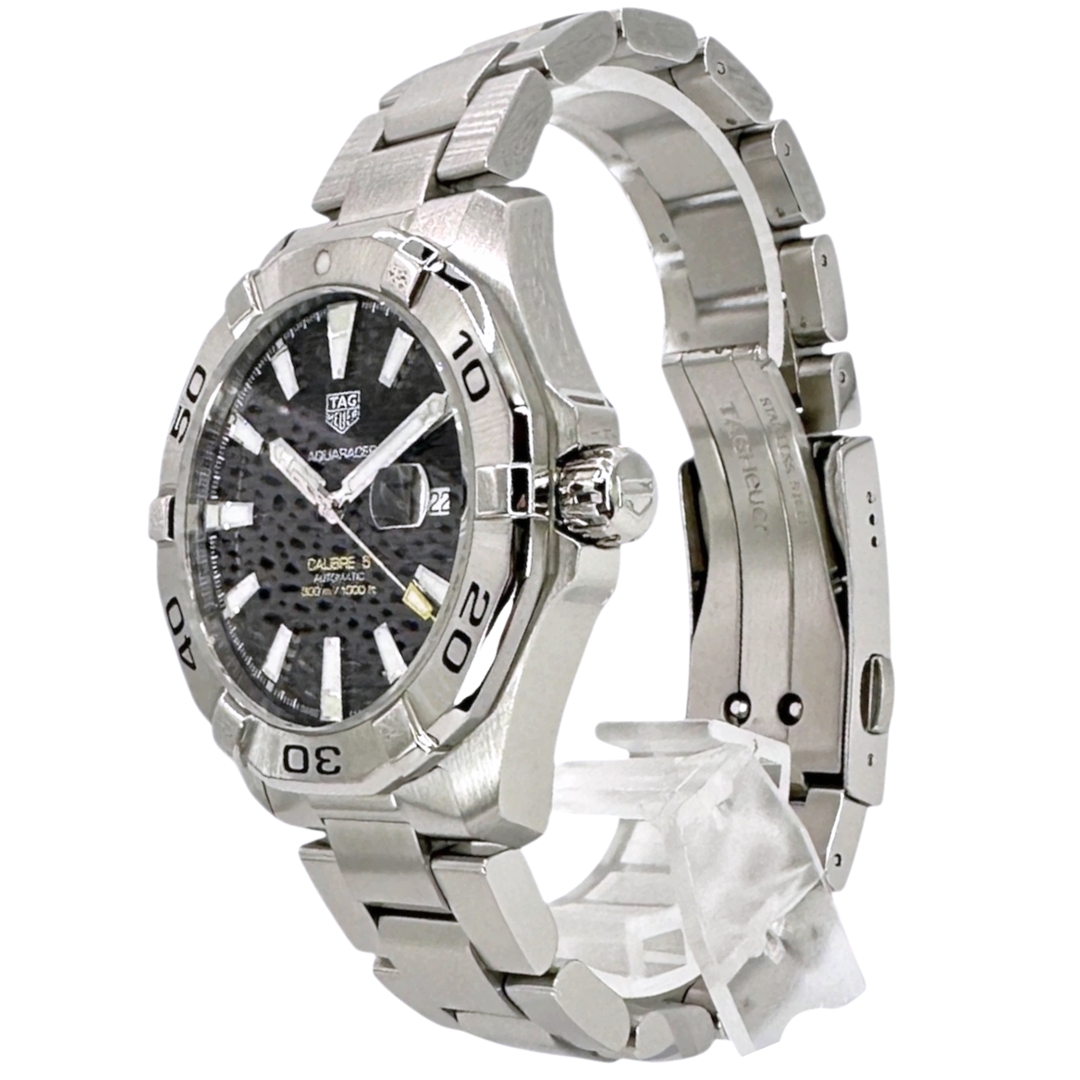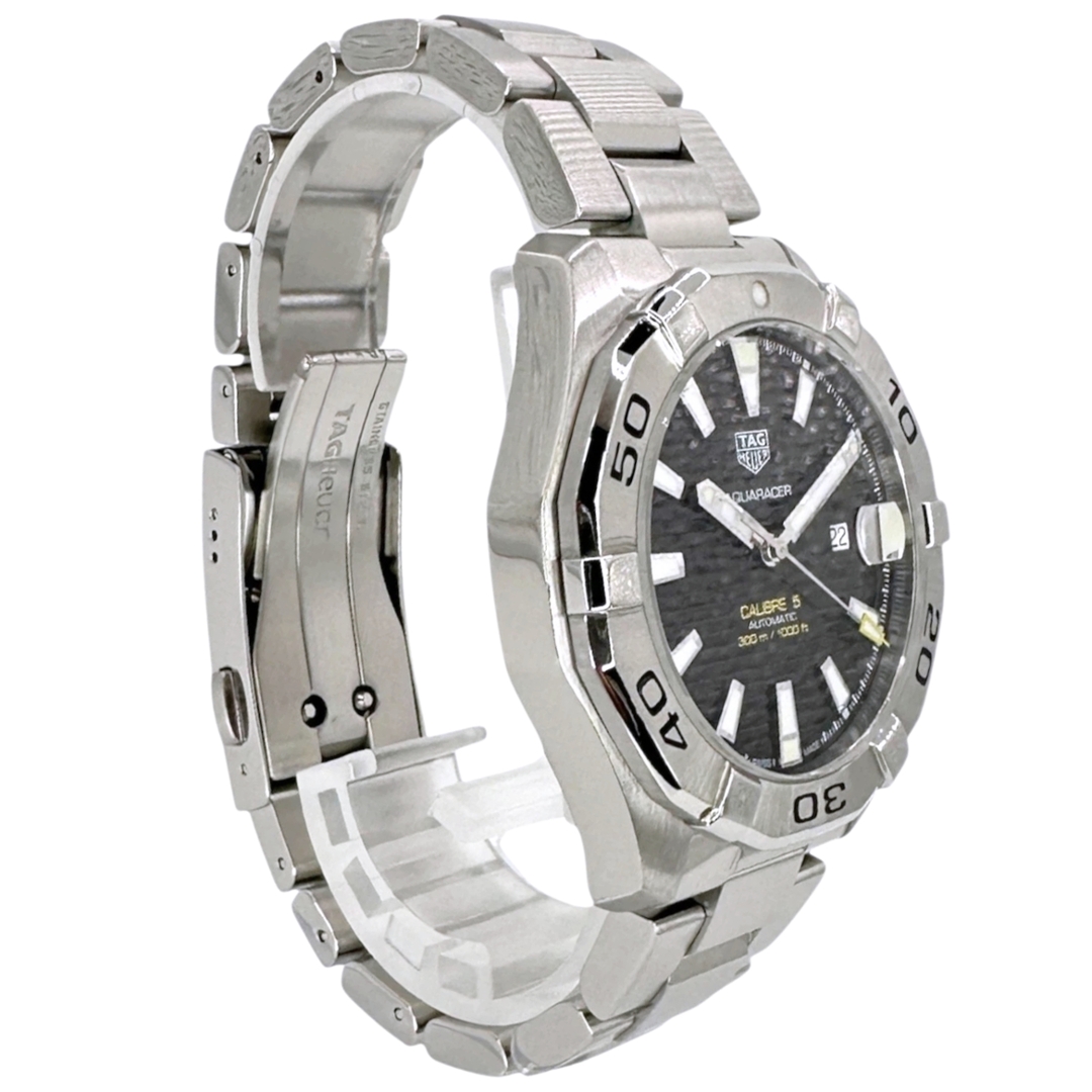 A Tag Heuer Aquaracer reference WAY2010 in stainless steel with a black dial, presented boxed and certified with original TAG Heuer paperwork. The 43mm case features the signature unidirectional bezel with bold, engraved numerals, delivering a strong, purposeful dive-watch aesthetic. The black horizontal textured dial enhances legibility, complemented by luminous baton hour markers and a date aperture at 3 o’clock.