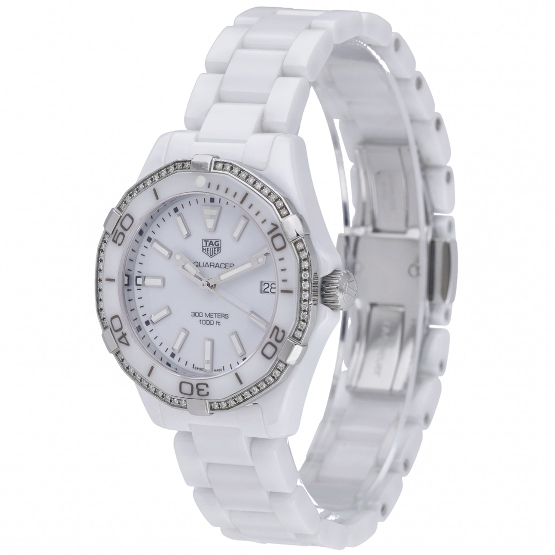 A Tag Heuer Aquaracer Watch, White Ceramic with a Diamond Bezel on a White Dial