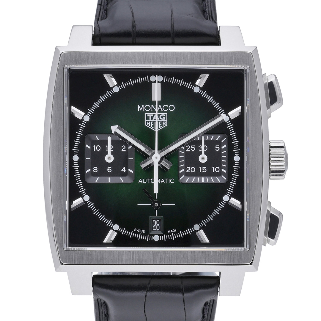 A TAG Heuer Monaco reference CL2116, an instantly recognisable square-cased chronograph that blends motorsport heritage with contemporary design. This 39mm stainless steel model is paired with a black leather strap and features a striking green sunburst dial, framed by angular chronograph sub-dials and bold applied hour markers. The left-hand crown and square pushers remain true to the Monaco’s unconventional and iconic design language.