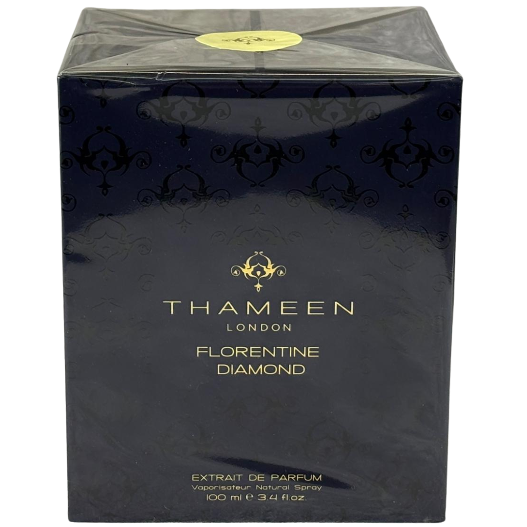 A 100ml bottle of Florentine Diamond Extrait De Parfum by Thameen, presented in its official presentation box. Inspired by the brilliance and mystery of the legendary Florentine Diamond, this extrait delivers remarkable depth and radiance, crafted for those who appreciate refined yet commanding fragrances.