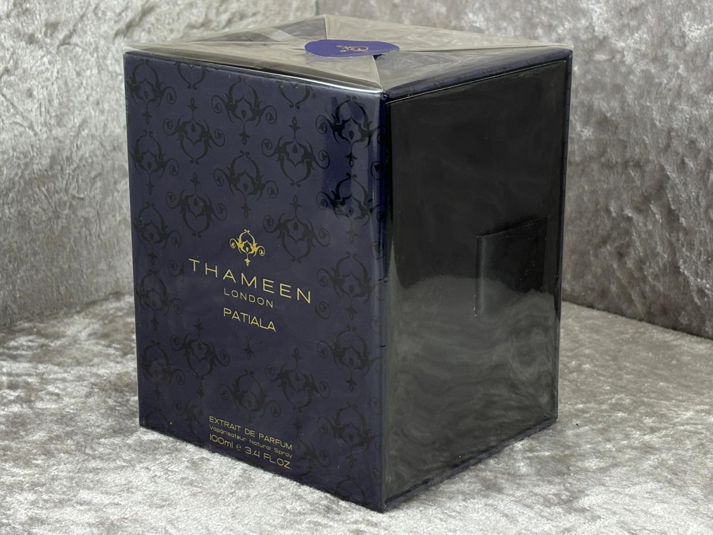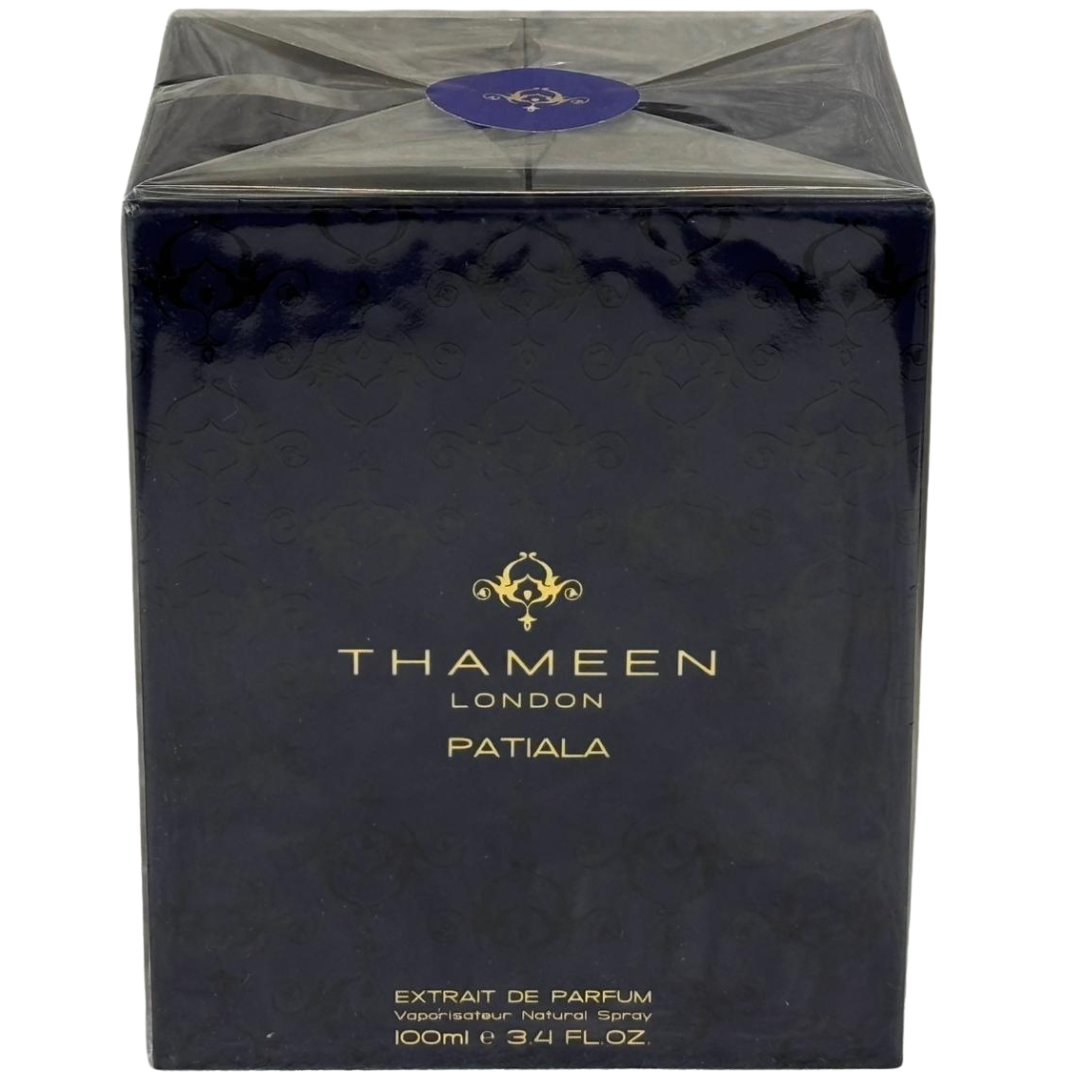 A 100ml bottle of Patiala Extrait De Parfum by Thameen, presented in its official presentation box. Inspired by the opulence of one of the world’s most magnificent jewels, this extrait delivers exceptional richness and depth, crafted for those who appreciate bold, statement-making fragrances.