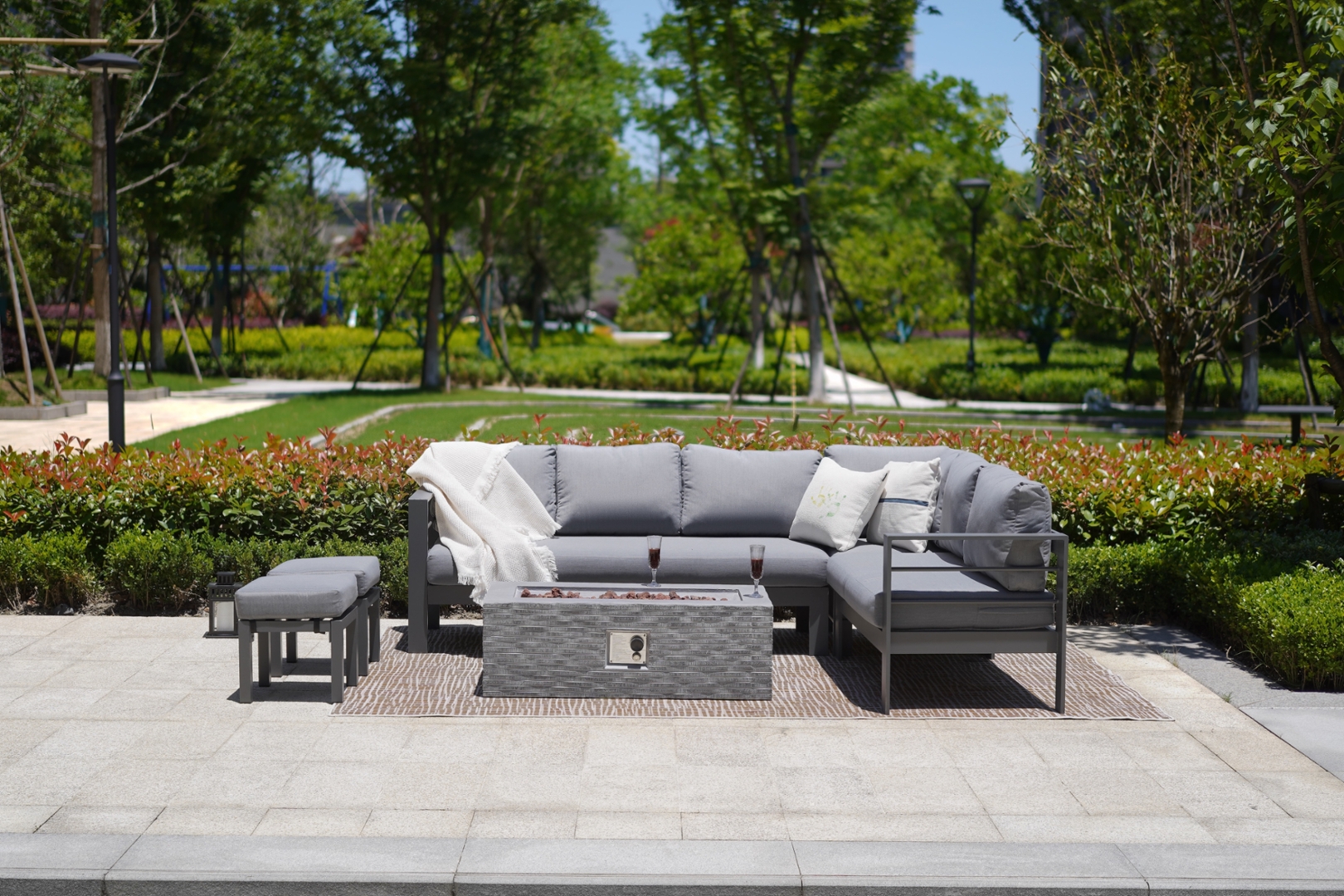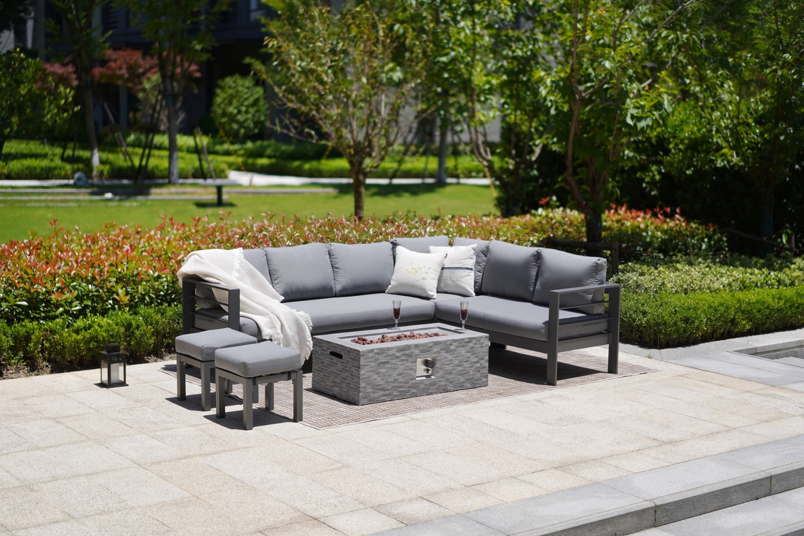 The Luxembourg Aluminium 8 Seat Corner Sofa Set With Firepit Table & 2 Cushioned Stools.
