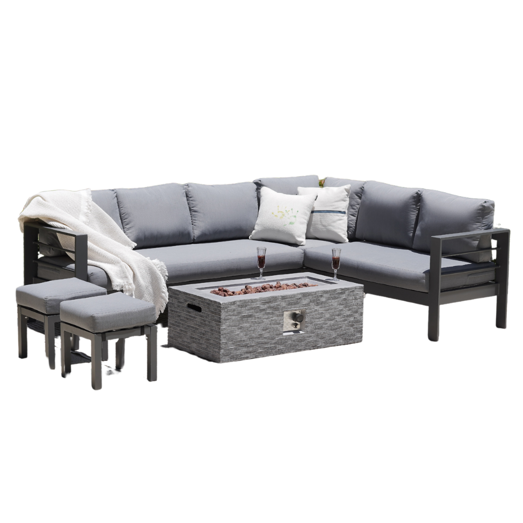 An Aluminium 8-Seat Corner Sofa Set, featuring a sleek firepit table and two cushioned stools. Crafted with durability and style in mind, the set is perfect for creating a cosy and inviting atmosphere in any garden or patio.
