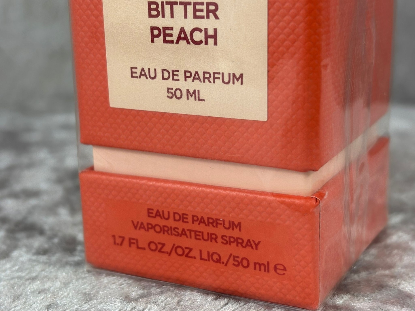 A 50ml bottle of Bitter Peach Eau De Parfum by Tom Ford. This bold Private Blend fragrance is celebrated for its indulgent, sun-drenched character, pairing luscious fruit with warm, sensual depth. Vibrant yet sophisticated, it delivers an immediately captivating presence that feels both playful and refined.
