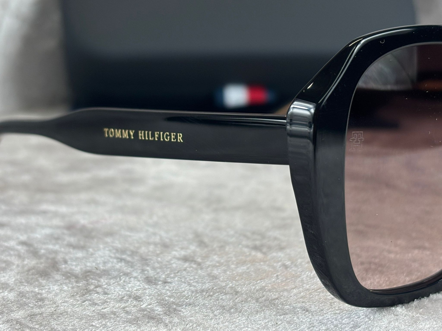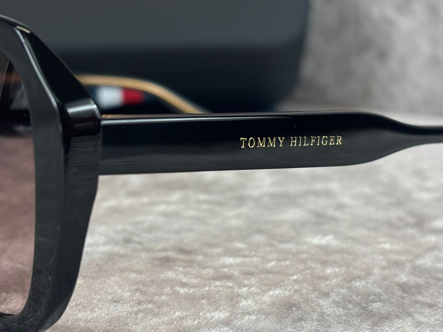 Crafted with attention to detail, the smooth black finish is enhanced by subtle Tommy Hilfiger branding along the temples, offering a refined signature touch. The clean lines and slightly oversized profile provide a modern edge, while the lightweight construction ensures comfortable wear throughout the day. This is a design that captures classic American style with a contemporary twist.