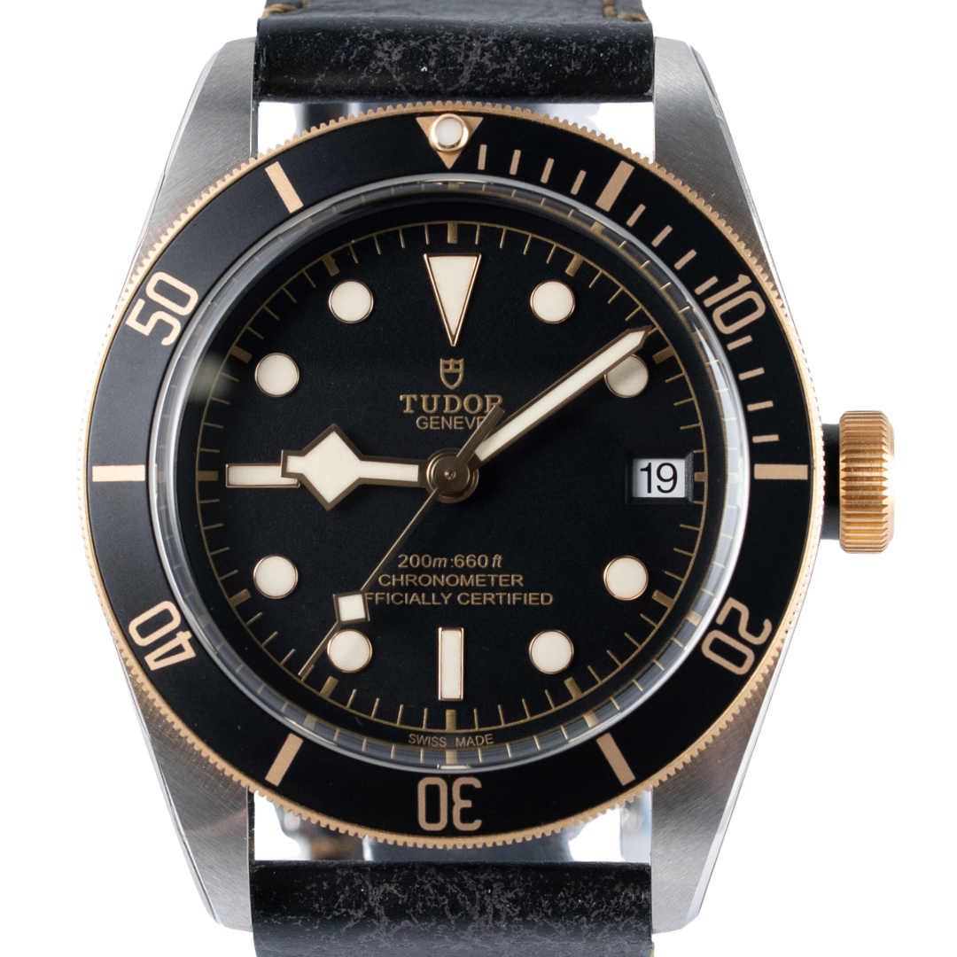 A Tudor Black Bay Watch, Bi-Metal, Stainless Steel Case and Clasp & with an 18ct Yellow Gold Bezel on a Black Dial with a Black Leather Strap.