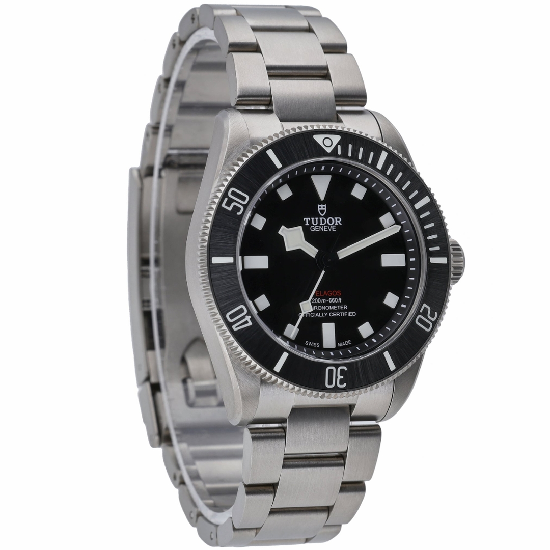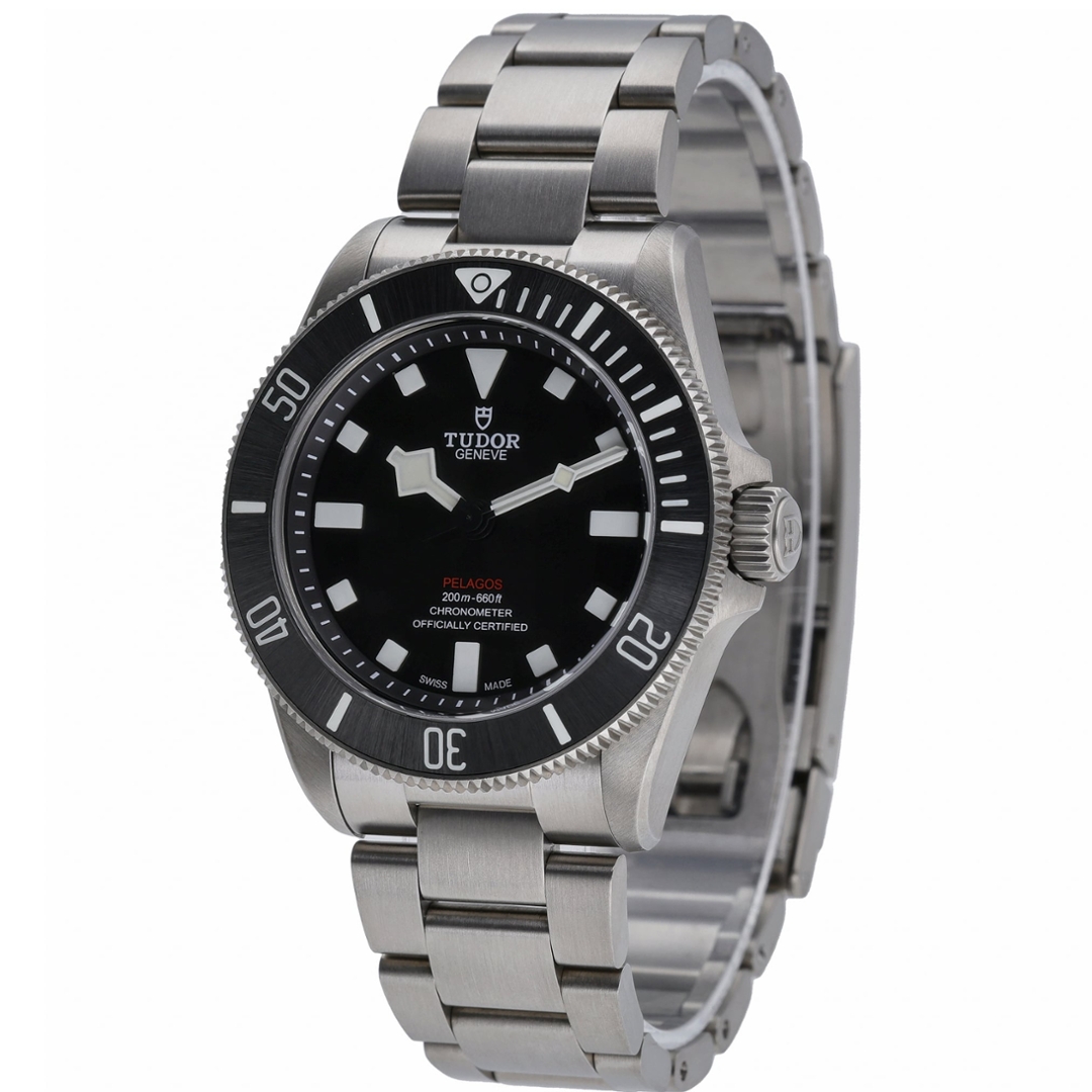A Tudor Pelagos watch crafted entirely from lightweight titanium, featuring a sleek black ceramic bezel and matching black dial. Model number 25407N, this 2022 example represents the latest evolution of Tudor’s renowned dive watch line, powered by the COSC-certified Calibre MT5400 automatic movement. Delivering a 70-hour power reserve and outstanding accuracy, it upholds the Pelagos legacy of professional-grade reliability and durability. The 39mm case offers a perfectly balanced size, combining robust performance with exceptional comfort for everyday wear.