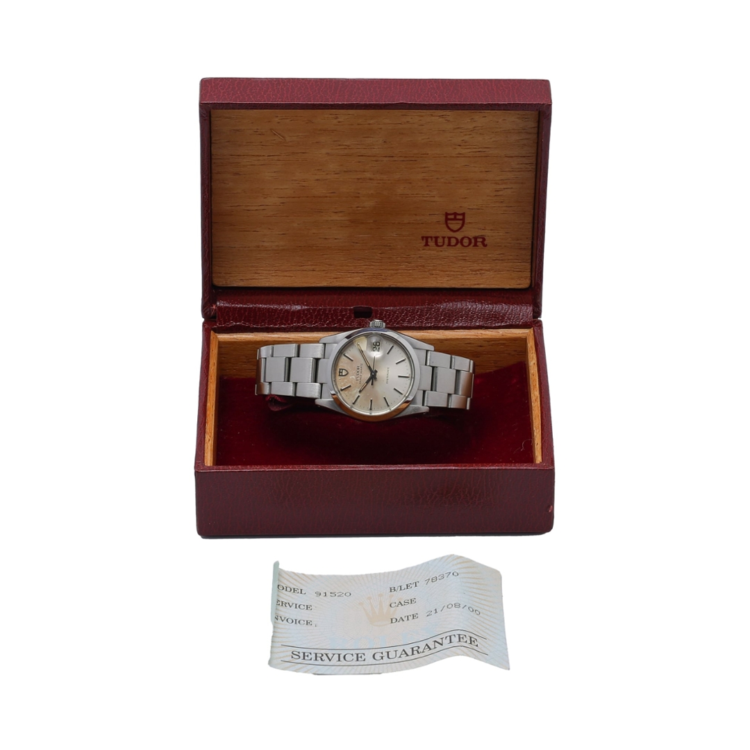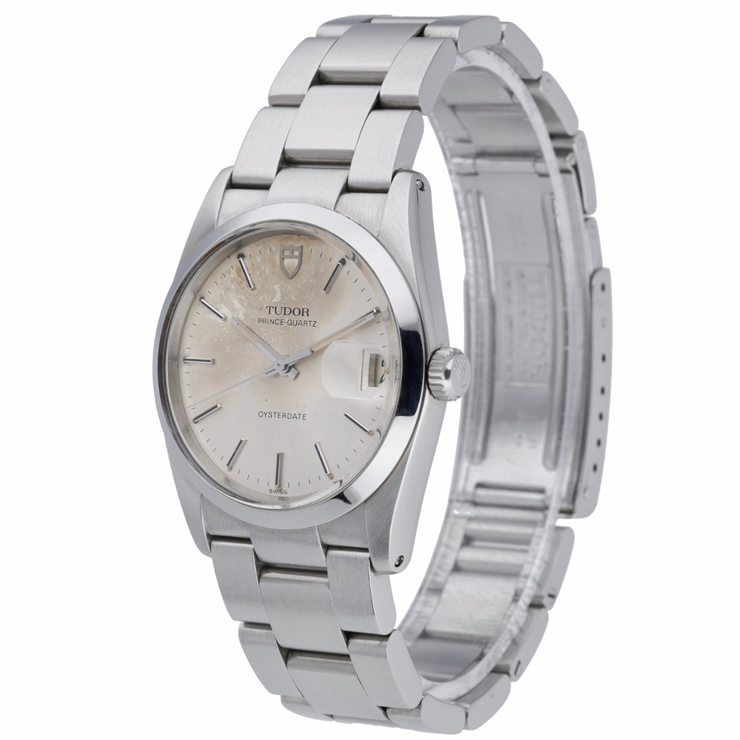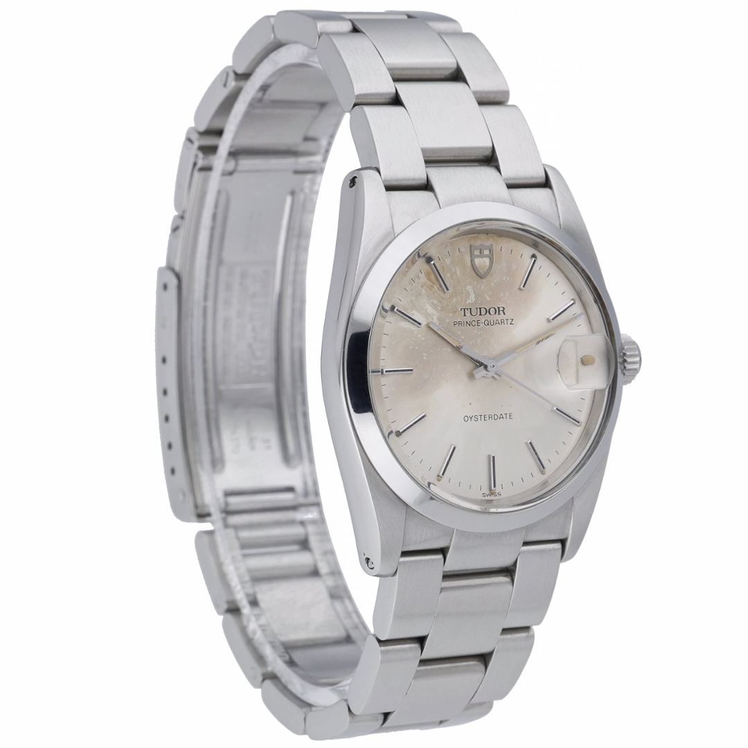 A Tudor Prince Oysterdate is a classic vintage stainless steel model, featuring a 34mm Oyster case paired with a silver dial that displays attractive natural ageing consistent with its era. The dial is fitted with applied baton hour markers and matching hands, complemented by the signature date aperture at 3 o’clock under a cyclops lens, reinforcing its strong Rolex-family design language.