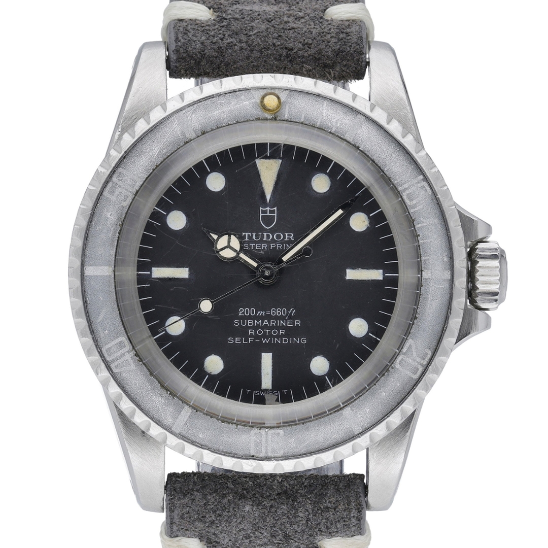 The black dial displays beautifully aged features, each developing a patina that enhances the watch’s character and authenticity. Its bidirectional bezel, domed acrylic crystal, and period-correct case proportions make it one of the most desirable vintage Tudor Submariner references among enthusiasts. The grey leather strap adds a refined contemporary contrast to its rugged origins, ensuring comfort while preserving the watch’s vintage aesthetic.