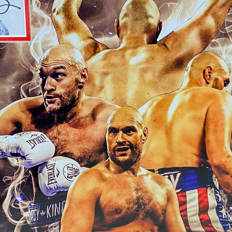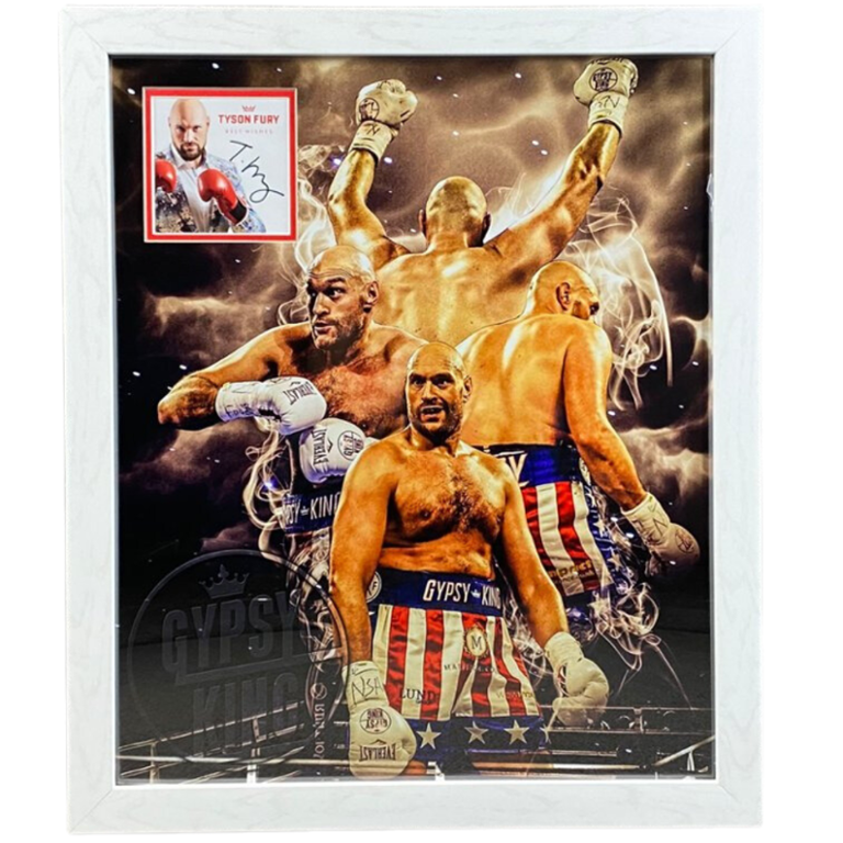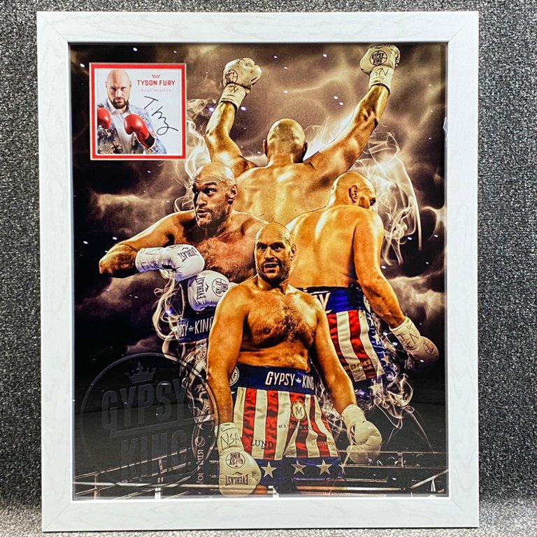 Authenticated with Fury's signature, this montage is a tangible testament to his dominance and enduring legacy in the sport. Whether displayed in a sports memorabilia collection, home gym, or enthusiast's space, this Tyson Fury Boxing Montage serves as a striking centrepiece, capturing the essence of one of boxing's most legendary figures. With its authenticity and visual appeal, it stands as a timeless homage to the excitement and prestige of championship boxing.