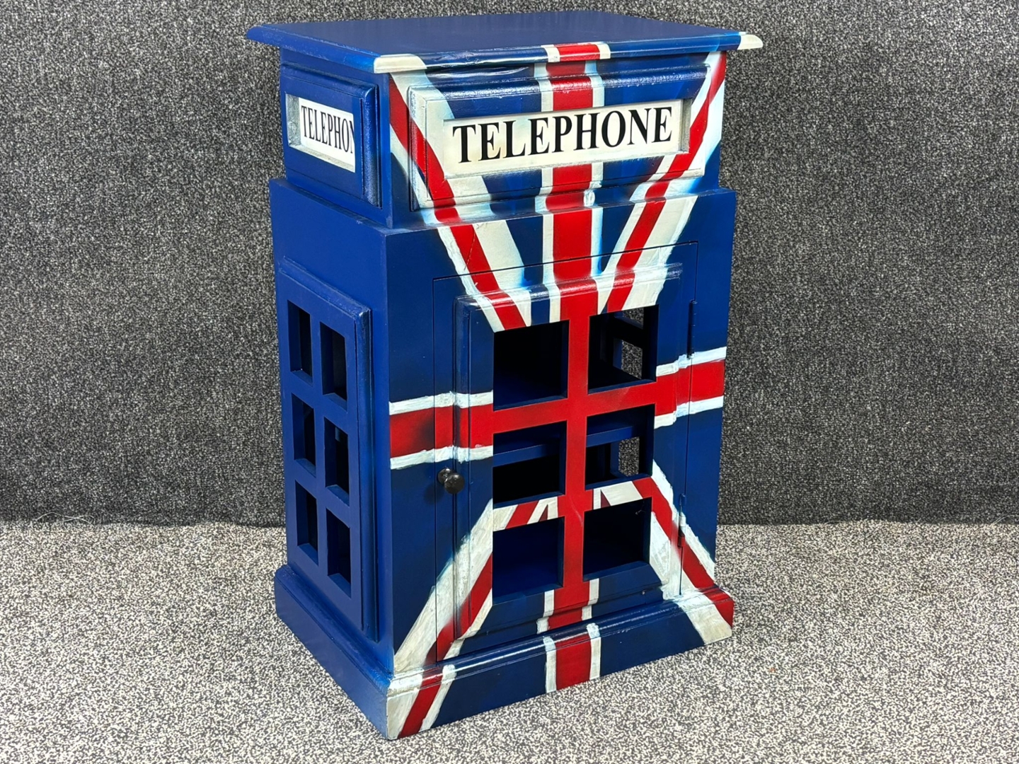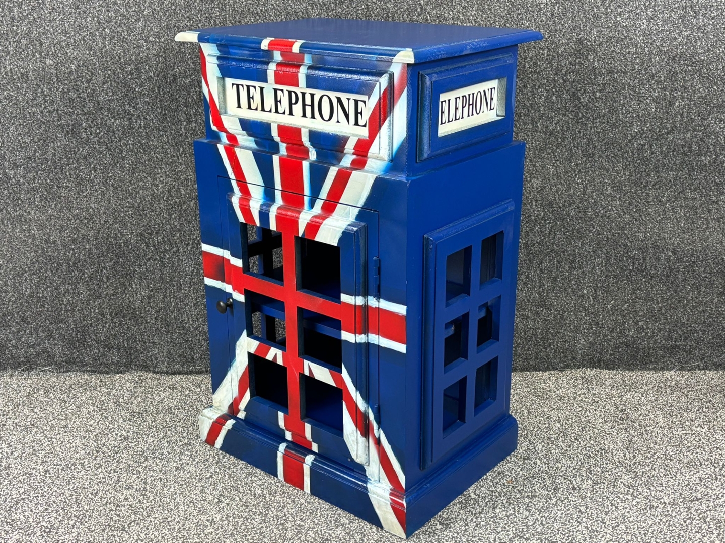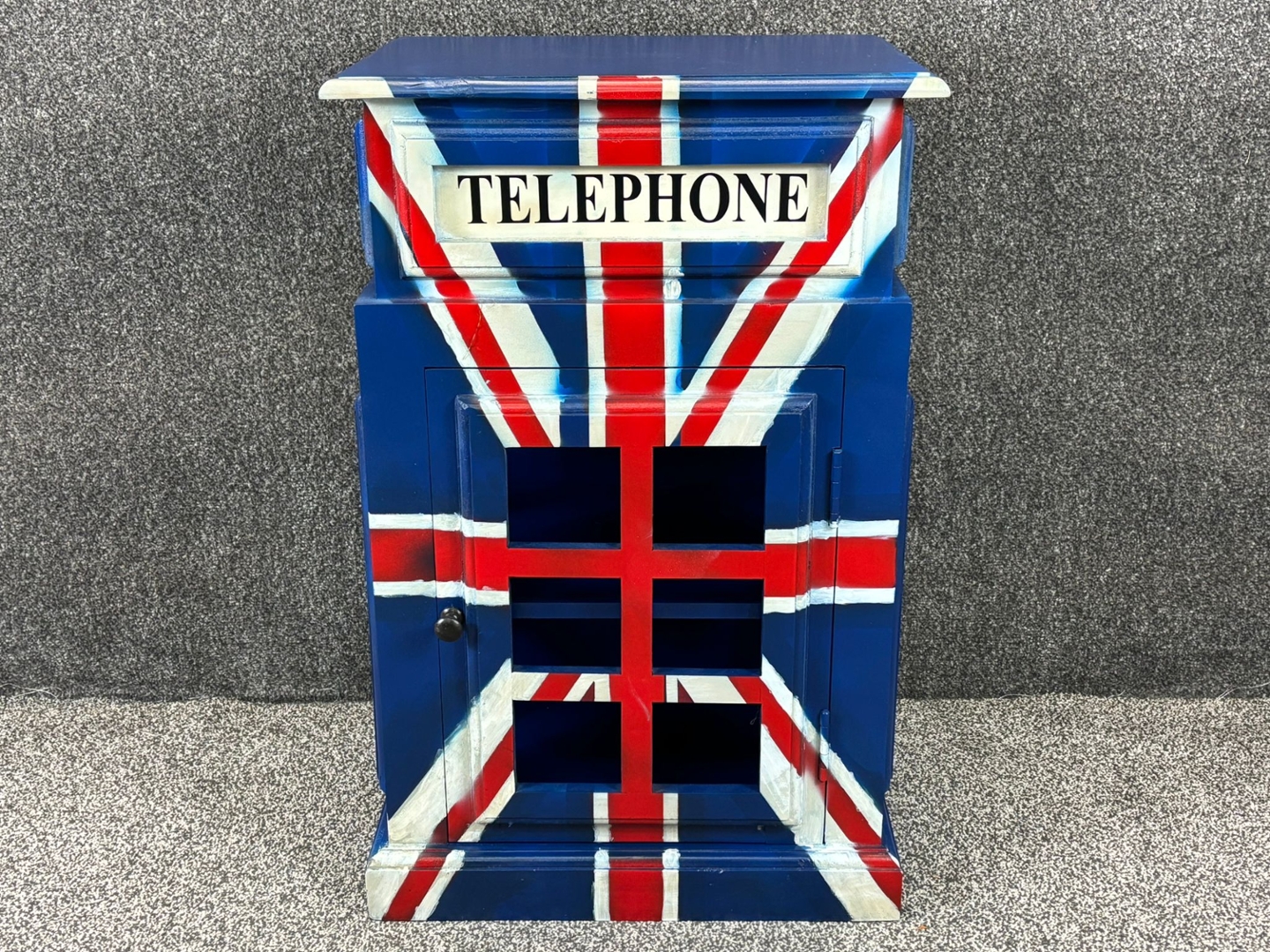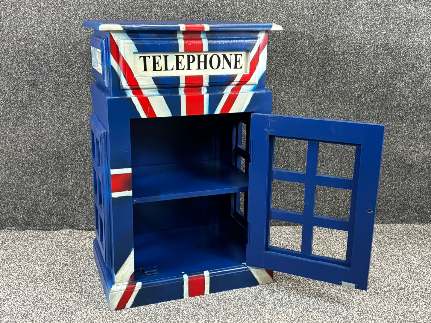 A Union Jack Telephone Box Style Side Table Cabinet. Approx 72cm height, 47cm width, 34cm depth.