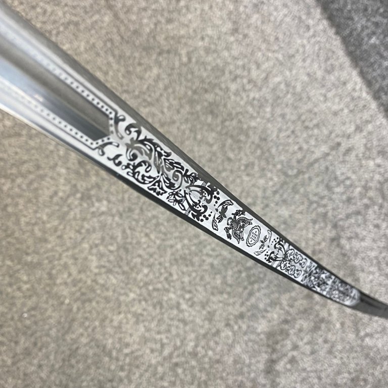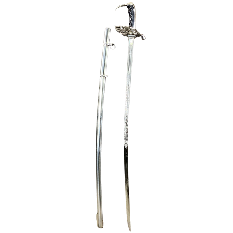 Accompanying the sword is a custom-designed sheath, meticulously constructed to provide a secure and dignified housing for the blade. Adorned with authentic embellishments and accents, the sheath adds to the overall authenticity and grandeur of the sword.