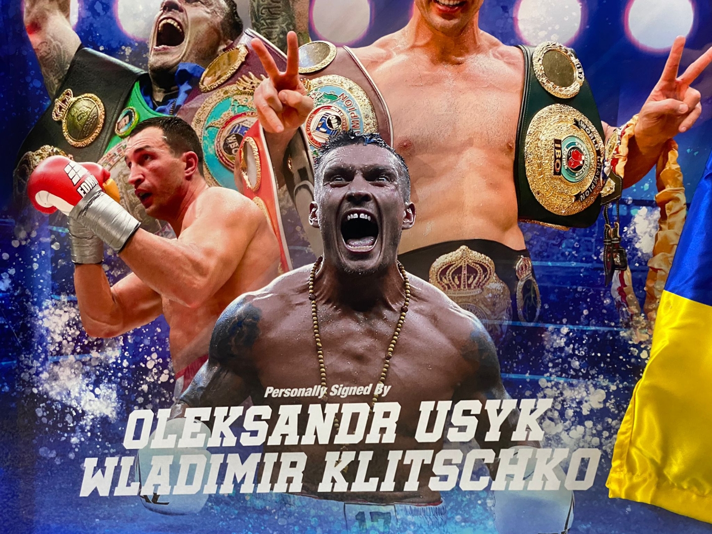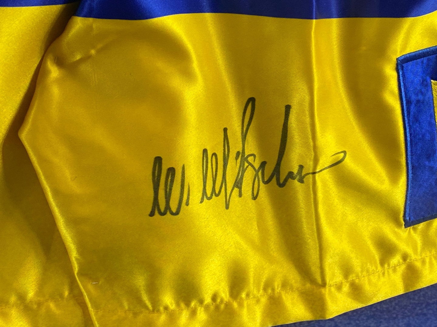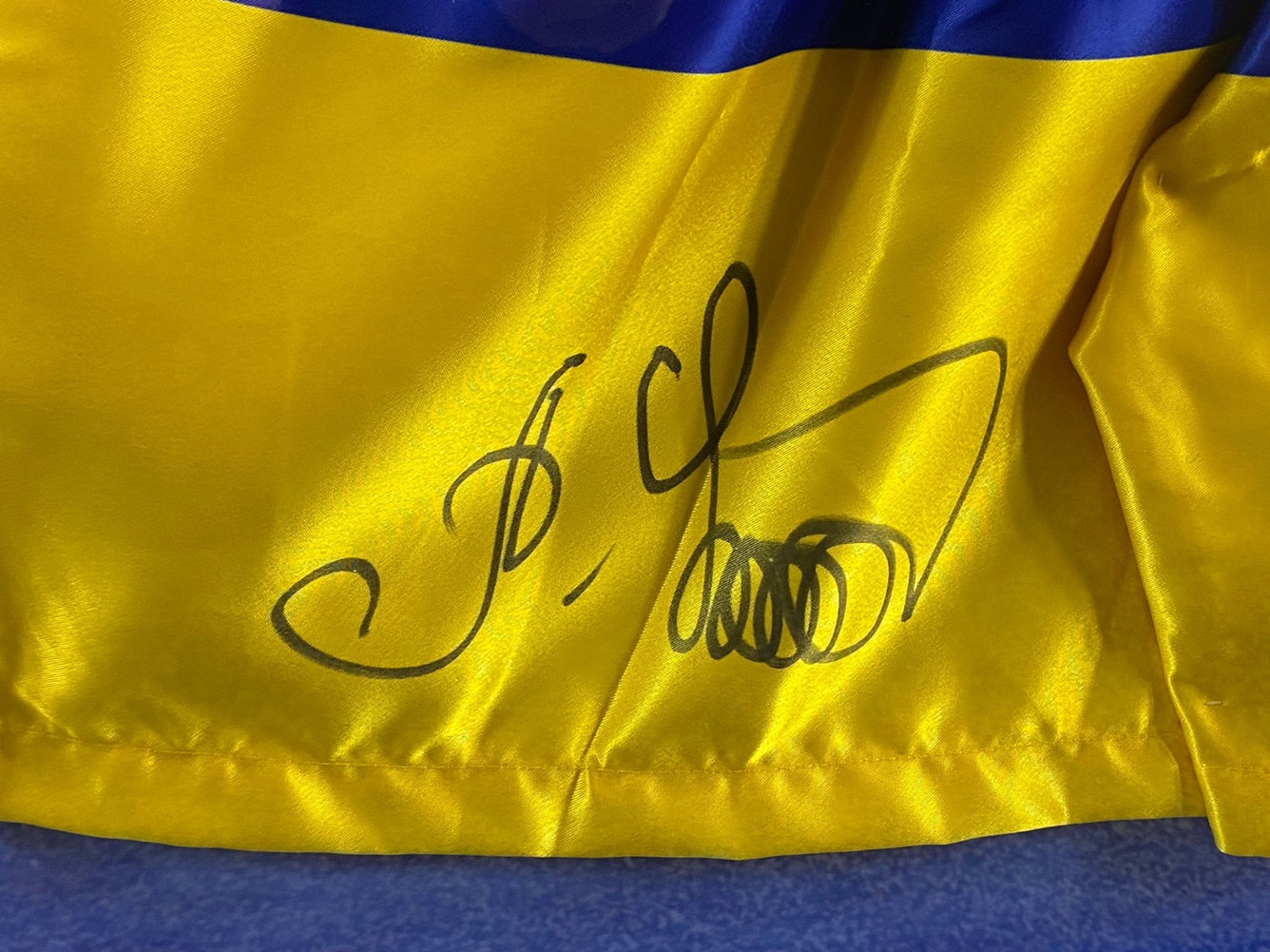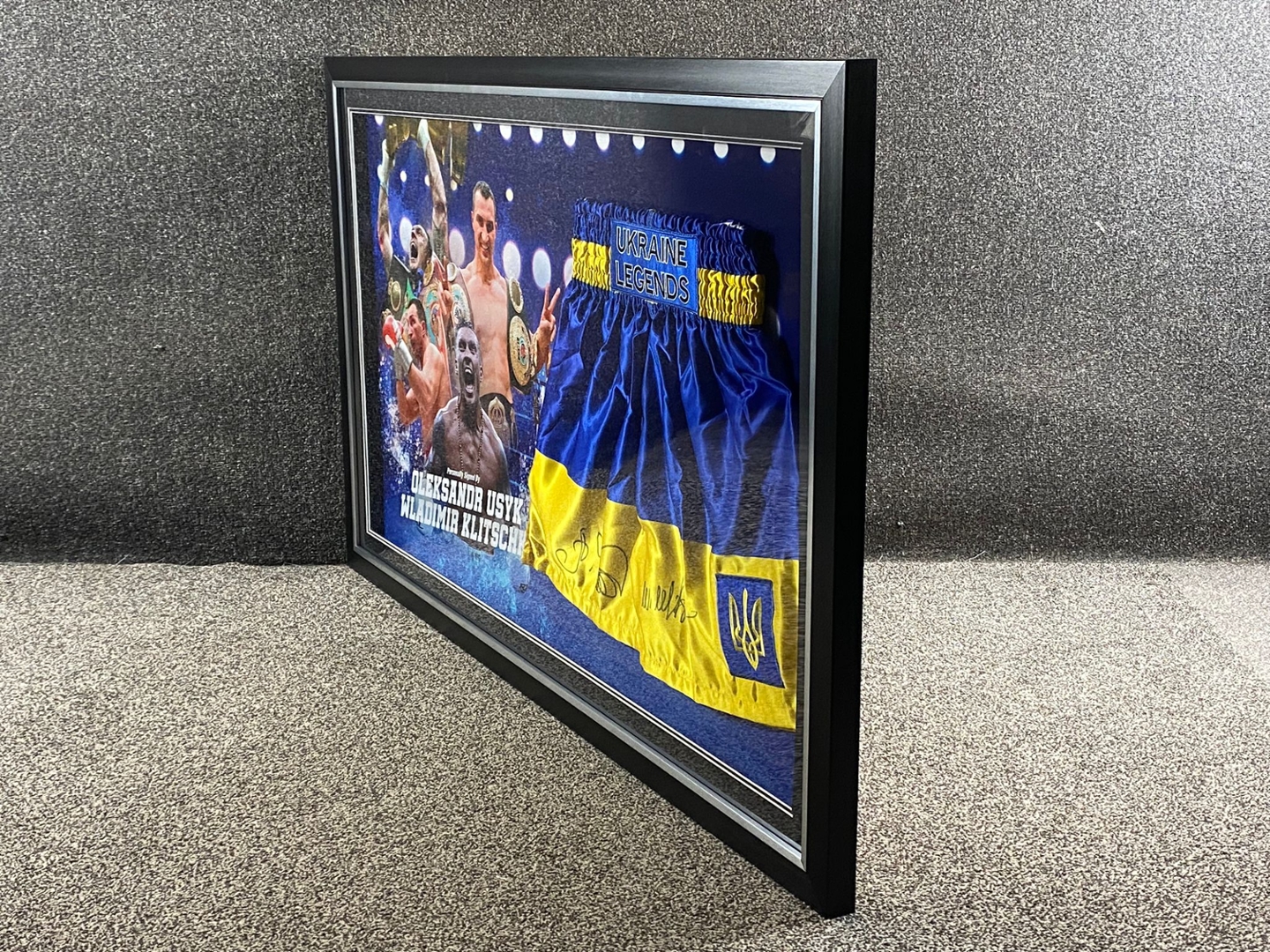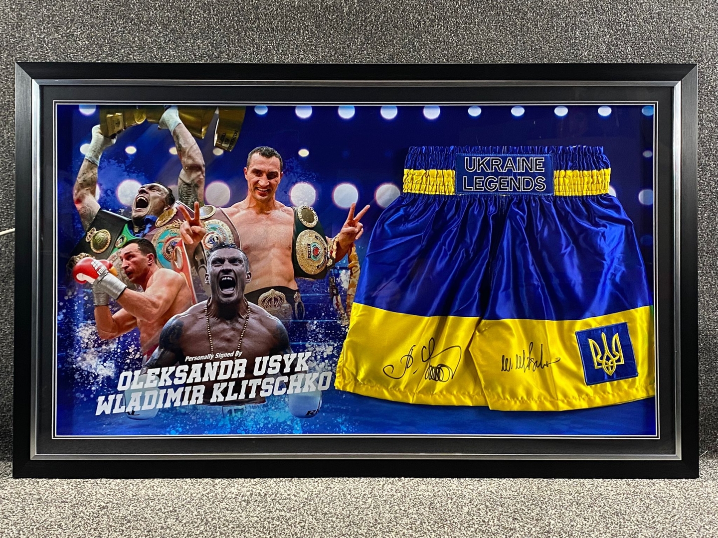 A signed & authenticated Oleksandr Usyk and Wladimir Klitschko Boxing Shorts in a light up presentation frame. Approx 31" height, 51" width.