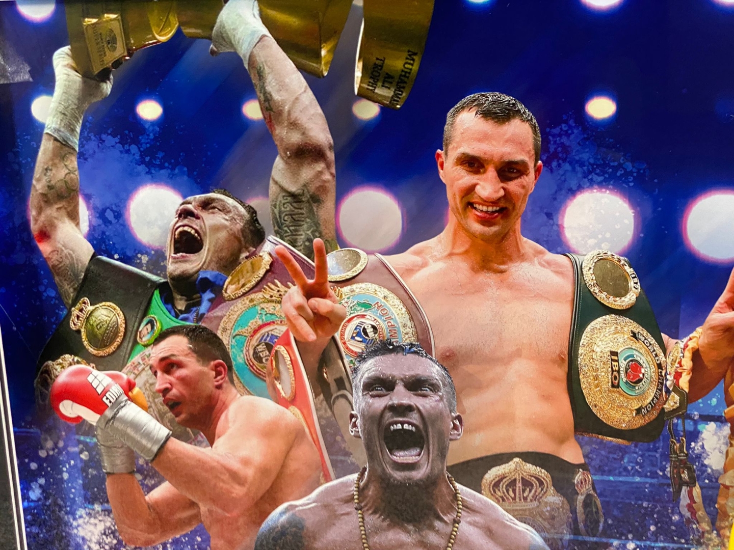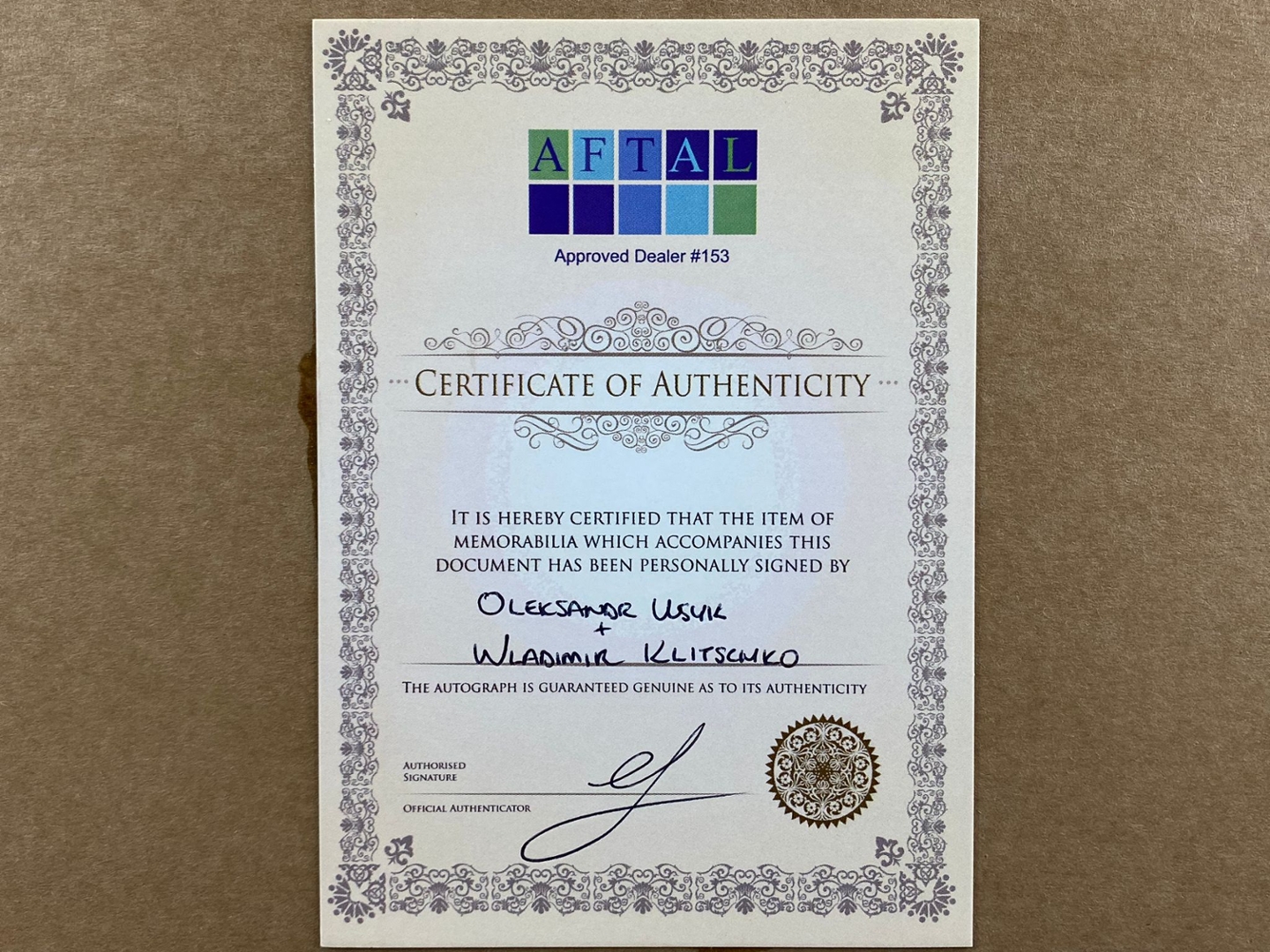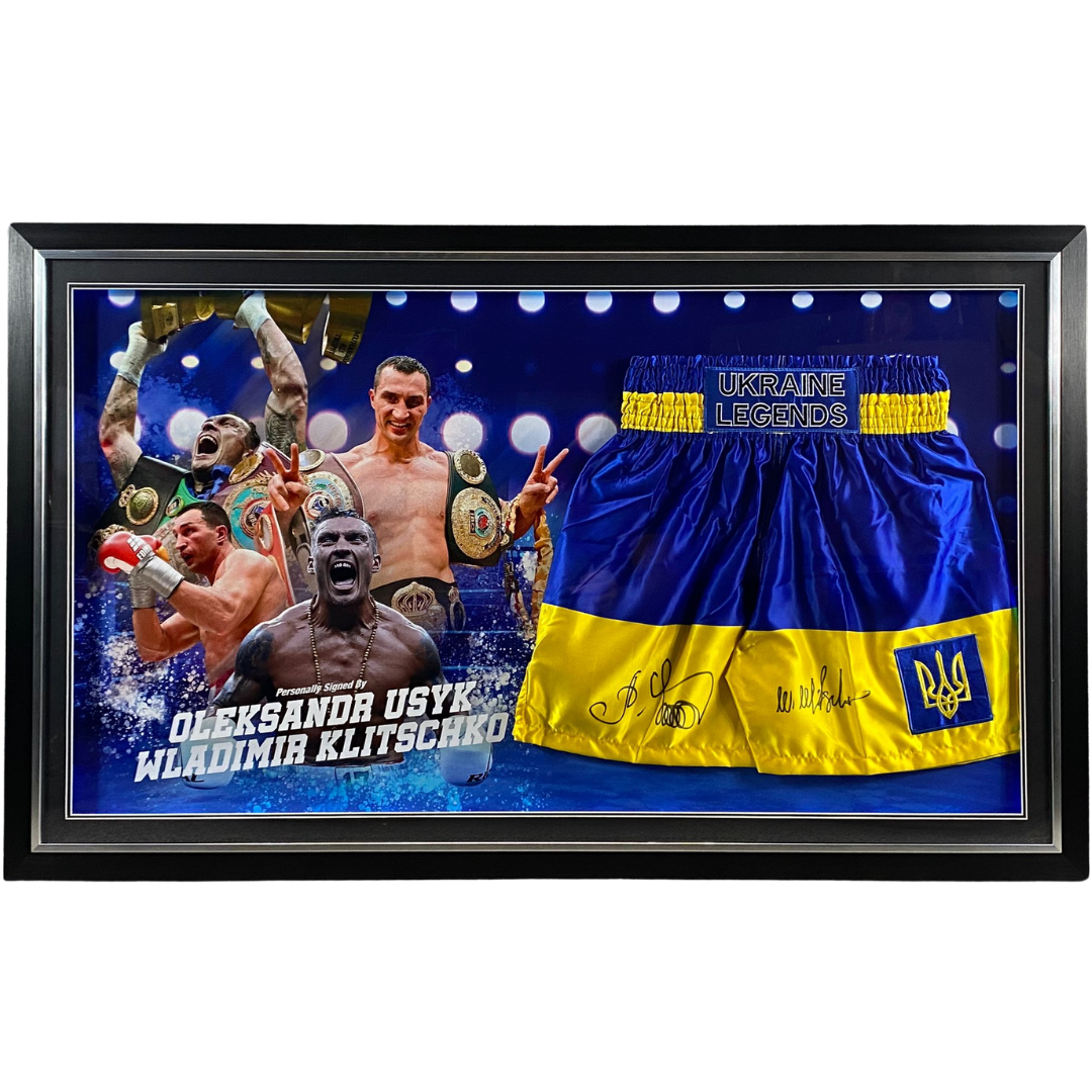 A signed and authenticated Oleksandr Usyk and Wladimir Klitschko pair of boxing shorts, elegantly displayed in a light-up presentation frame. Measuring approximately 31" in height and 51" in width, this stunning piece brings together two of Ukraine's greatest boxing champions. Usyk, the current pound-for-pound sensation, and Klitschko, the long-reigning heavyweight king, have both left an indelible mark on the sport with their skill, dedication, and dominance in the ring.
