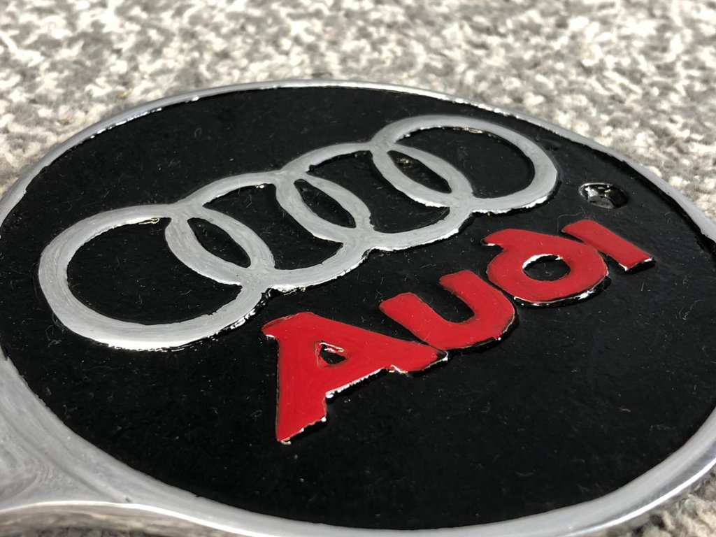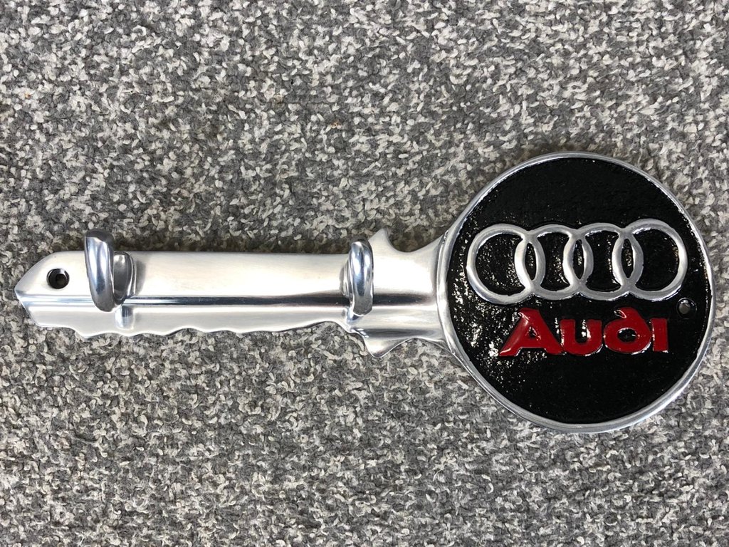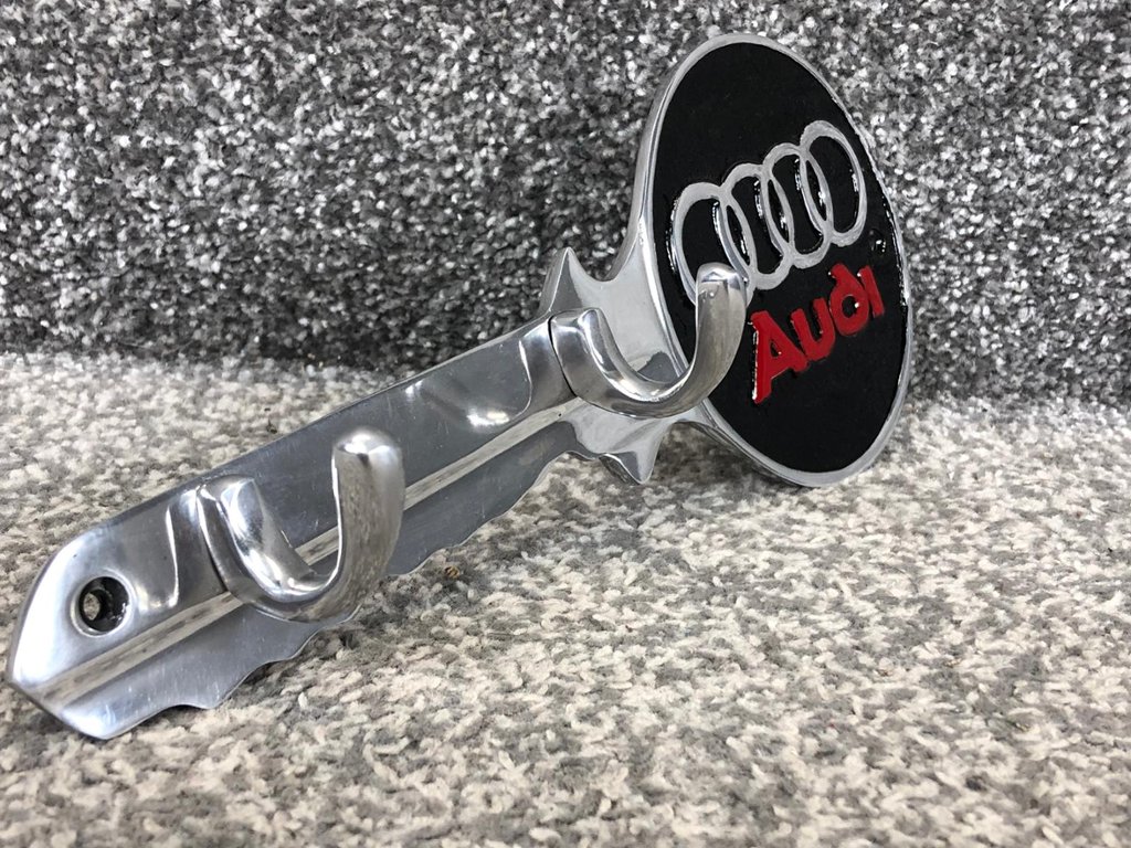 A wall-mountable silver aluminium Audi key holder. Approx 5" height, 12" width.