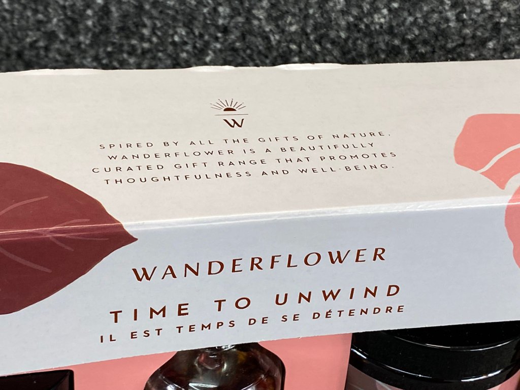 A Wanderflower Time To Unwind Pamper Gift Set. Approx 8 height, 10 width.