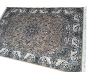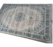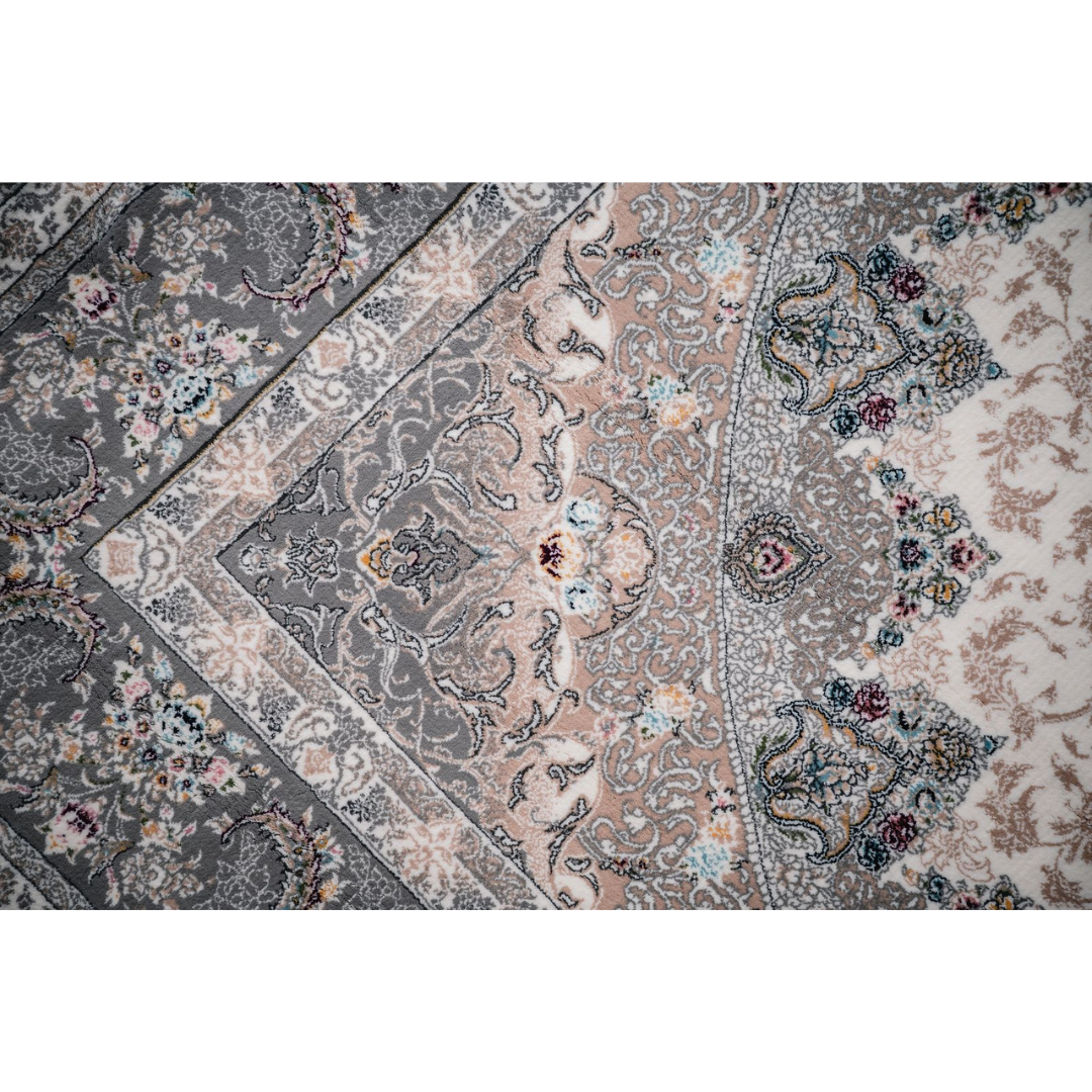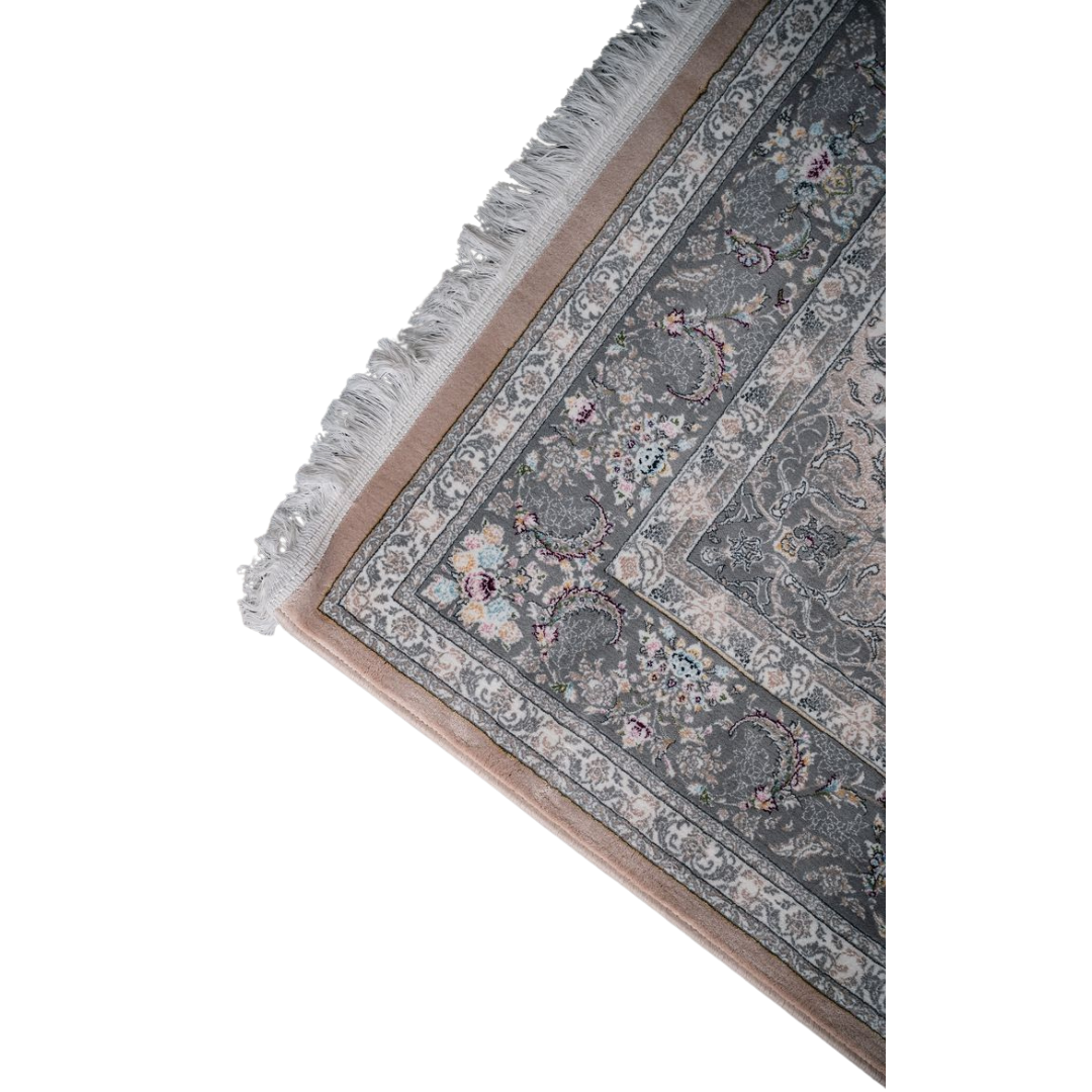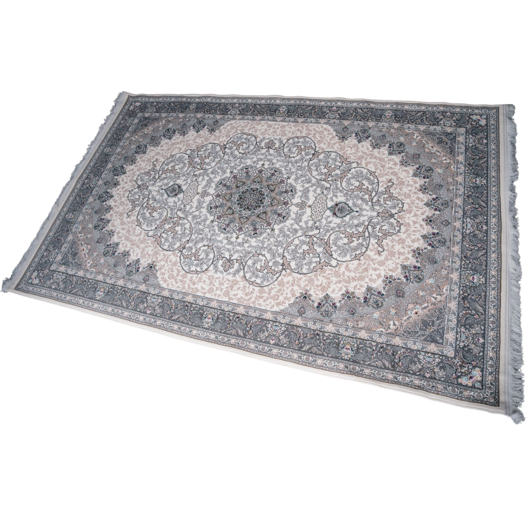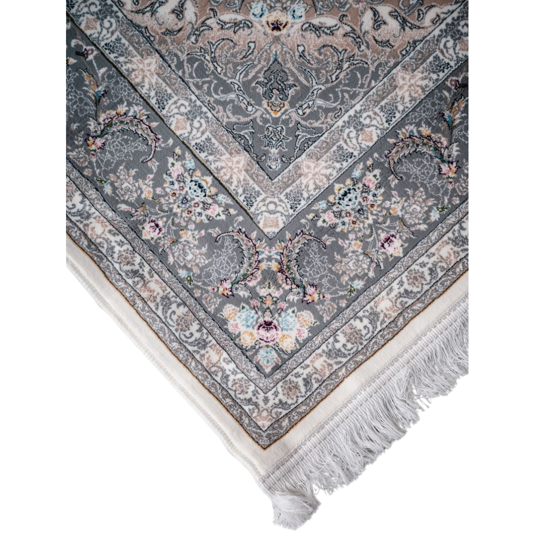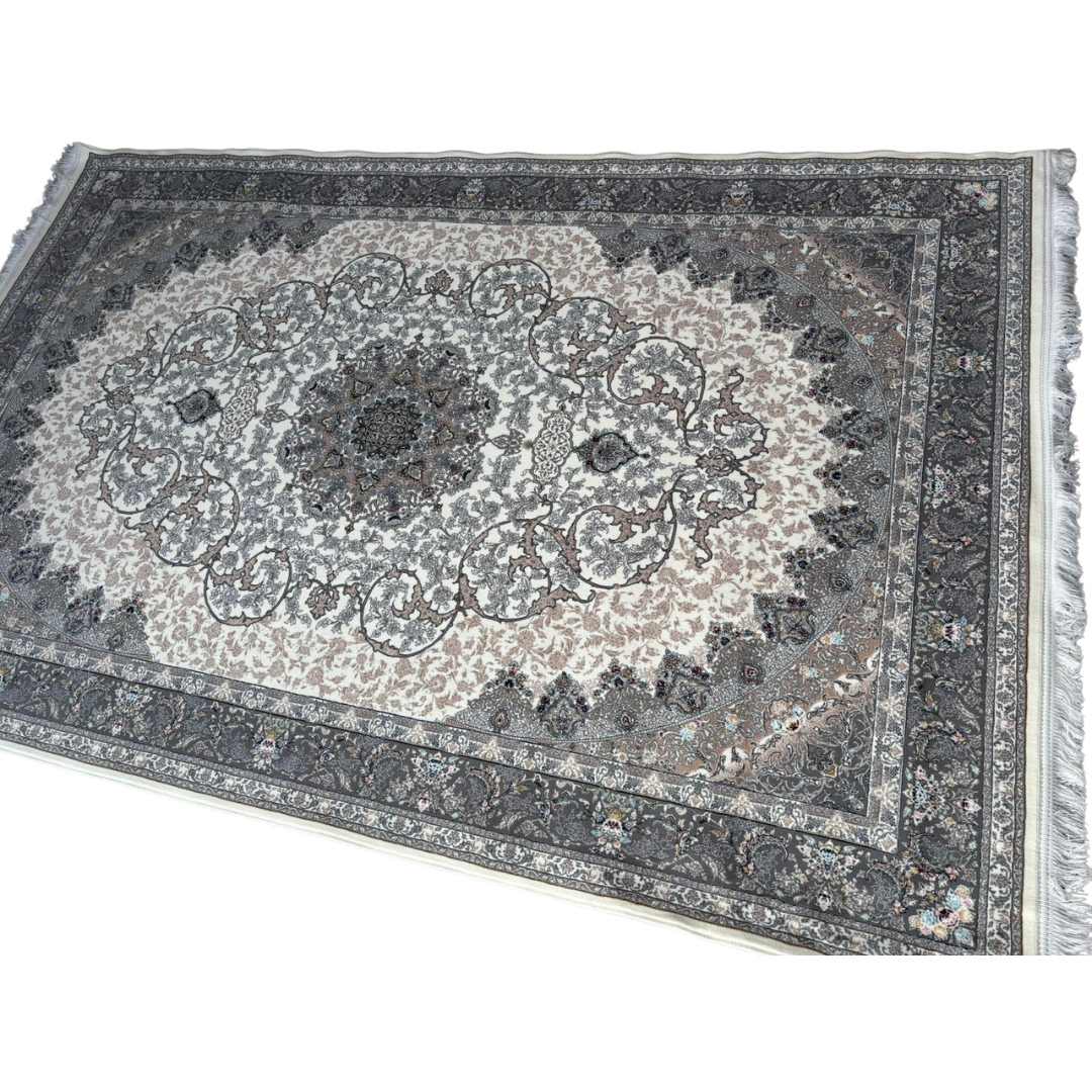 A Persian-style carpet showcases a refined white base, beautifully decorated with an intricate central medallion and graceful scrollwork patterns. The design is enhanced with subtle grey and beige tones, complemented by delicate floral details that add richness and depth to its appearance.