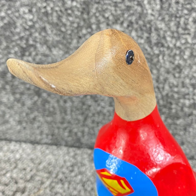 Crafted with meticulous attention to detail, the wooden sculpture showcases SuperDuck in a dynamic pose, ready to leap into action and save the day. From the determined expression on his face to the fluttering cape billowing behind him, every aspect of his heroic persona is rendered with lifelike precision.