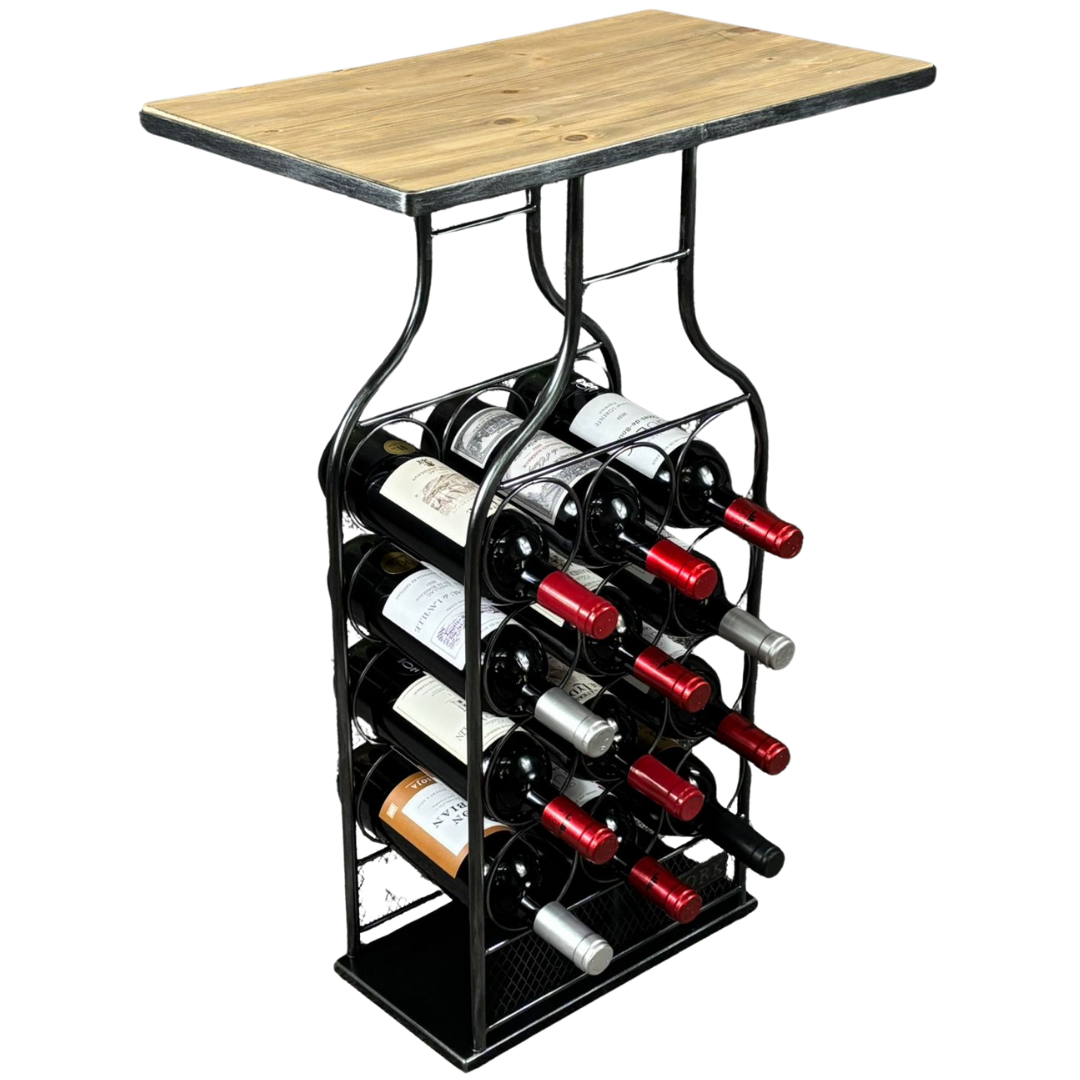 A wooden top 12 bottle wine rack table combines practical storage with an industrial-inspired design, making it a versatile addition to any dining area or home bar. Featuring a natural wooden tabletop, it offers a useful surface for serving drinks or displaying decorative items while adding warmth and character to the overall look.