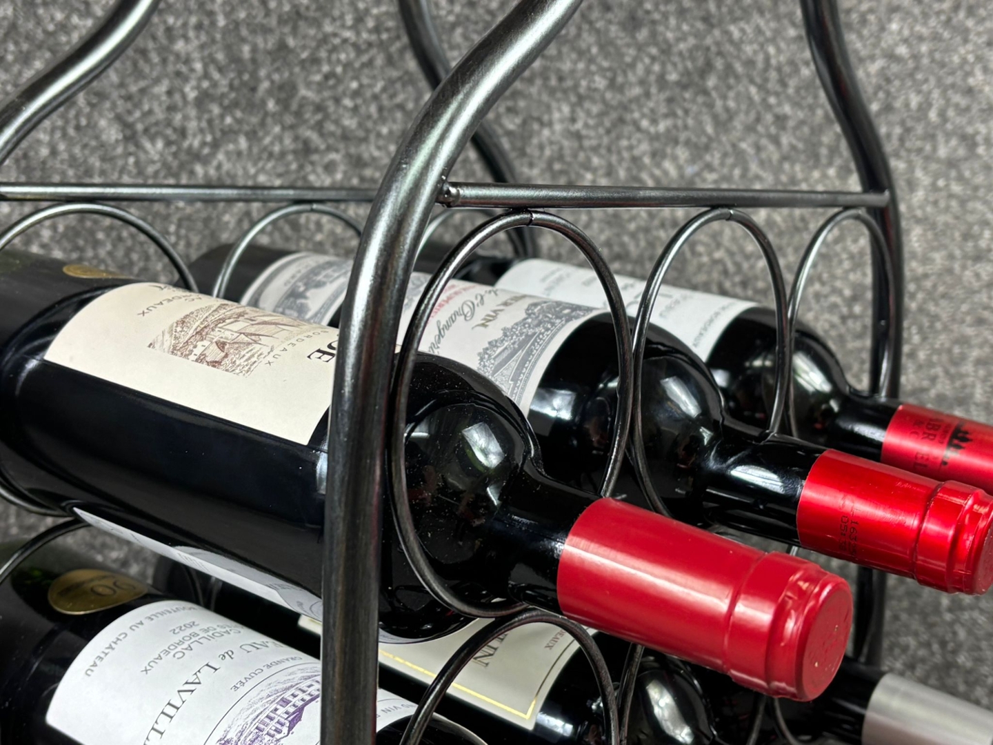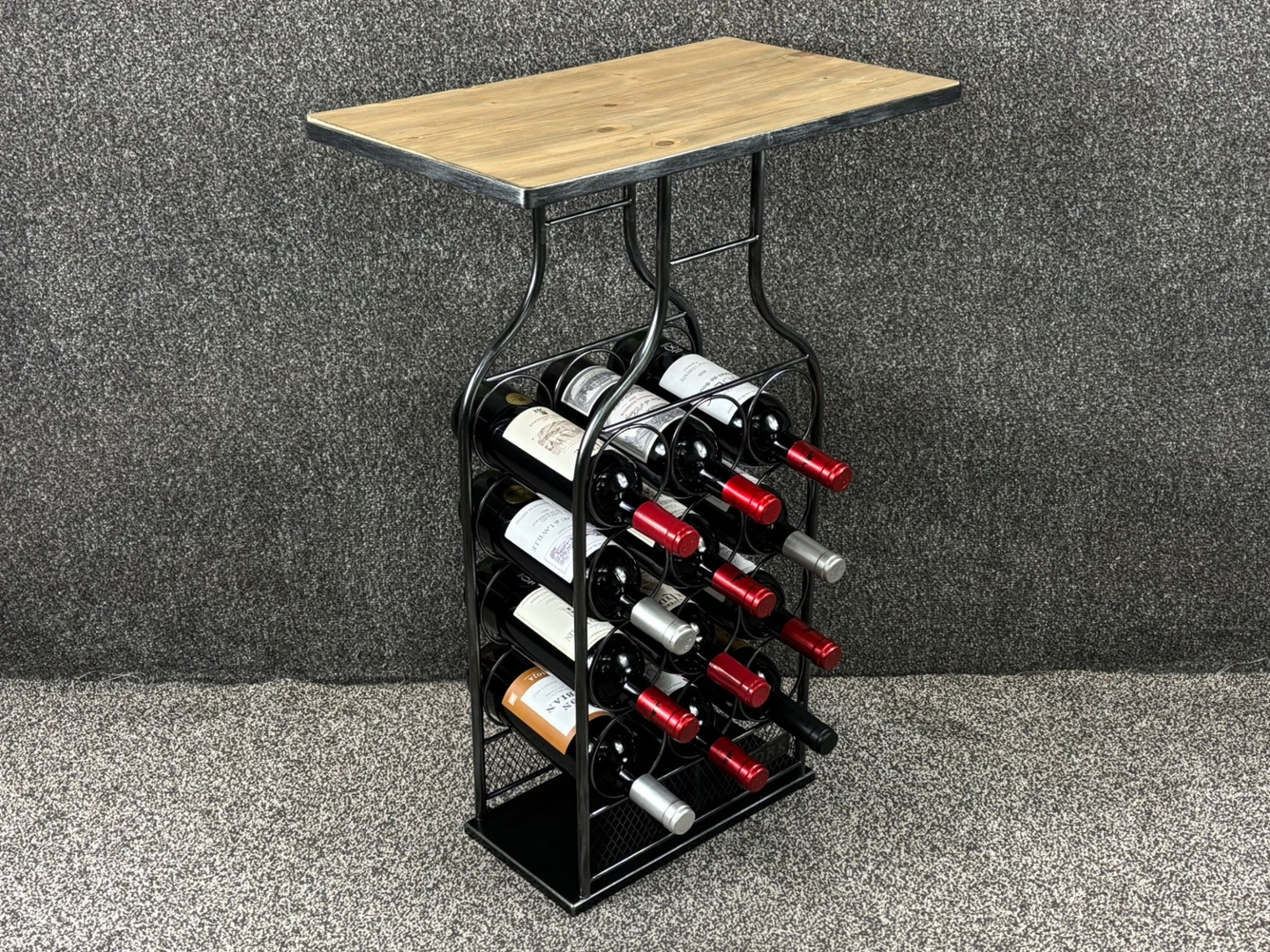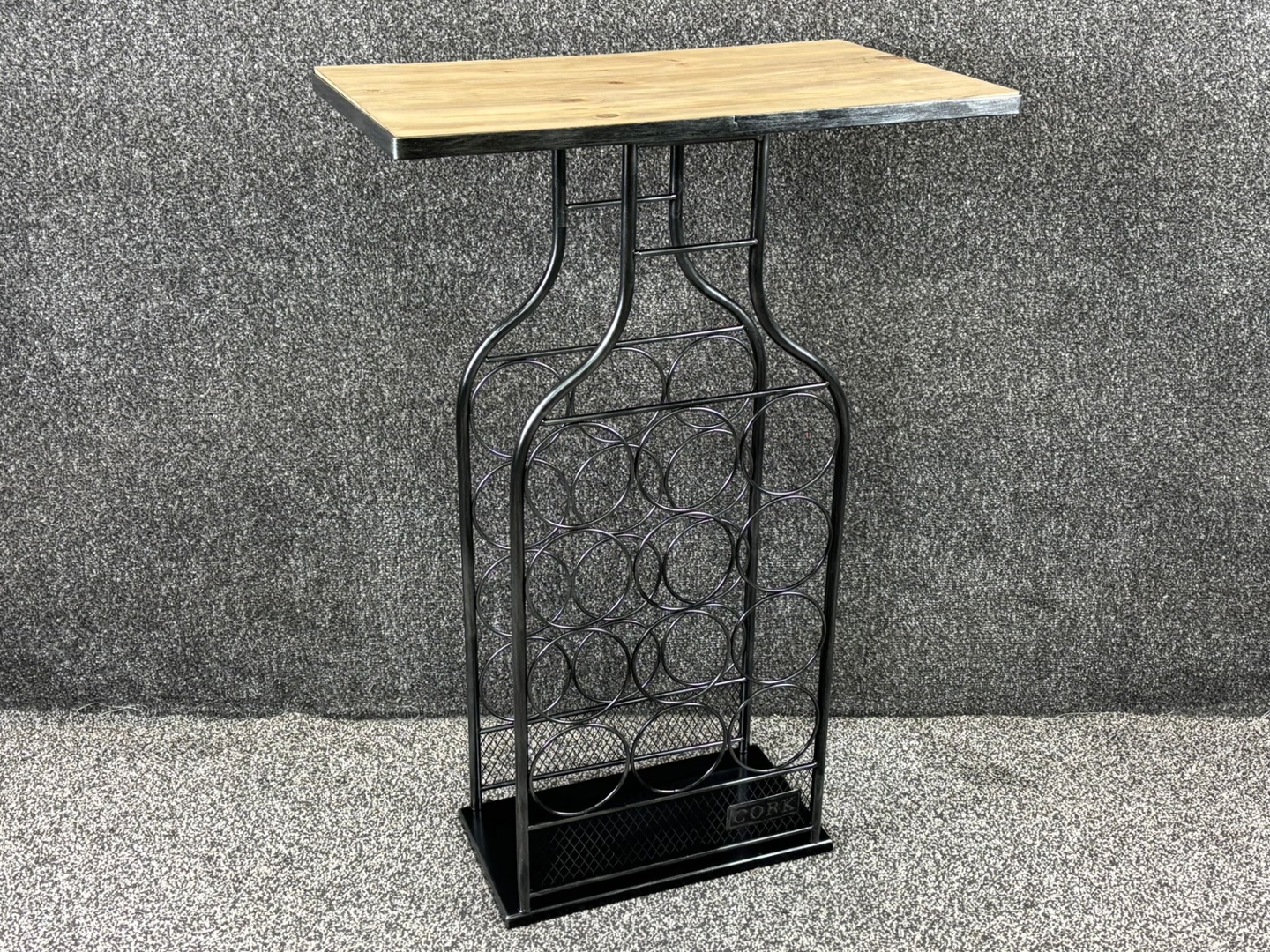 Beneath the tabletop, a black metal frame securely holds up to twelve standard wine bottles, neatly arranged for easy access and attractive display. The curved metal supports add visual interest while ensuring stability and durability. Measuring approximately 76cm in height, 50cm in width, and 30cm in depth, the proportions make it suitable for compact spaces without compromising functionality.