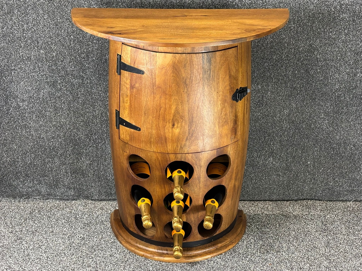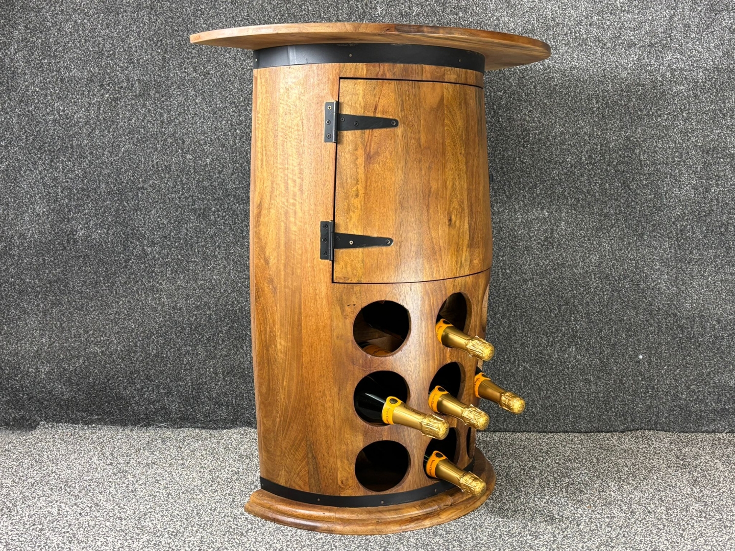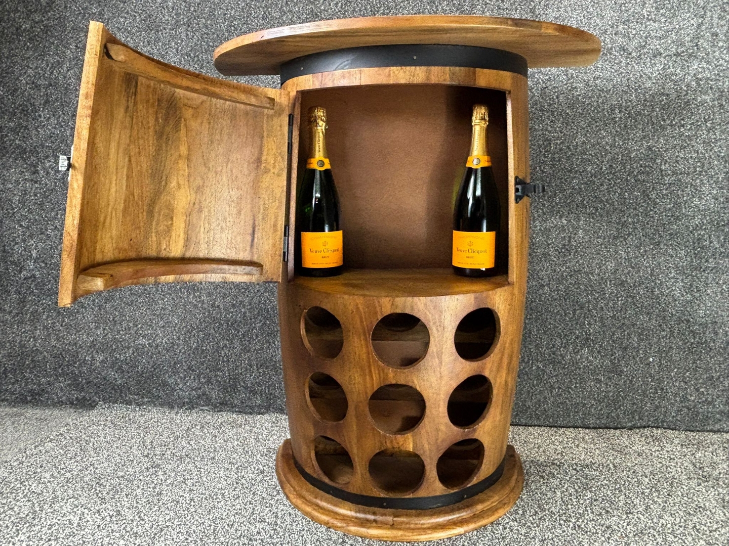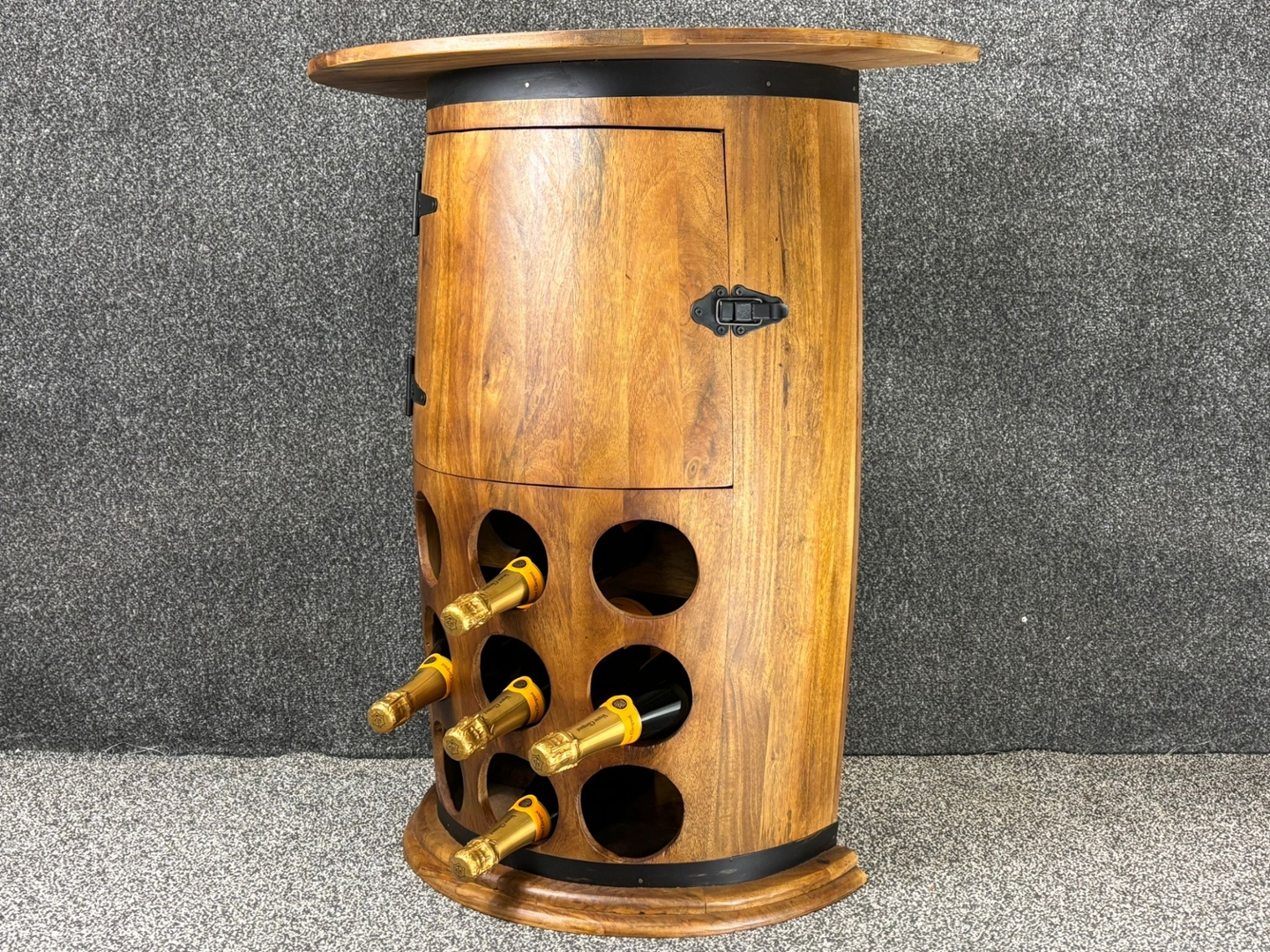 wood. The integrated bottle rack on the front provides an