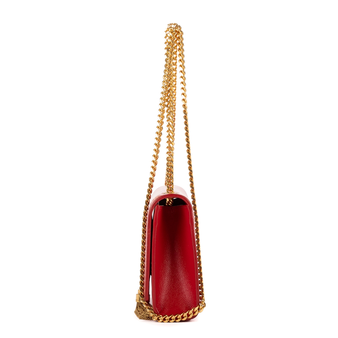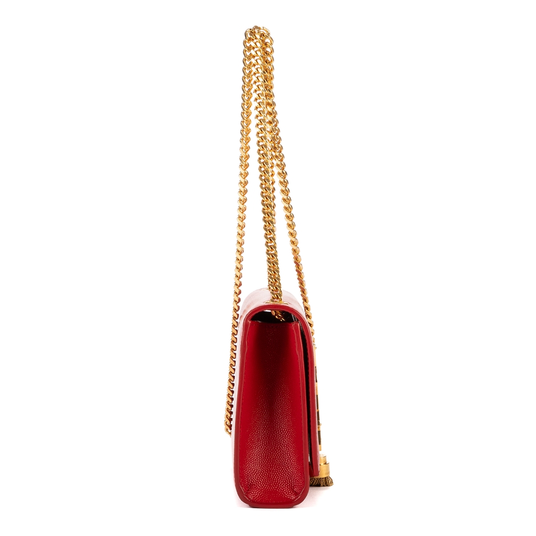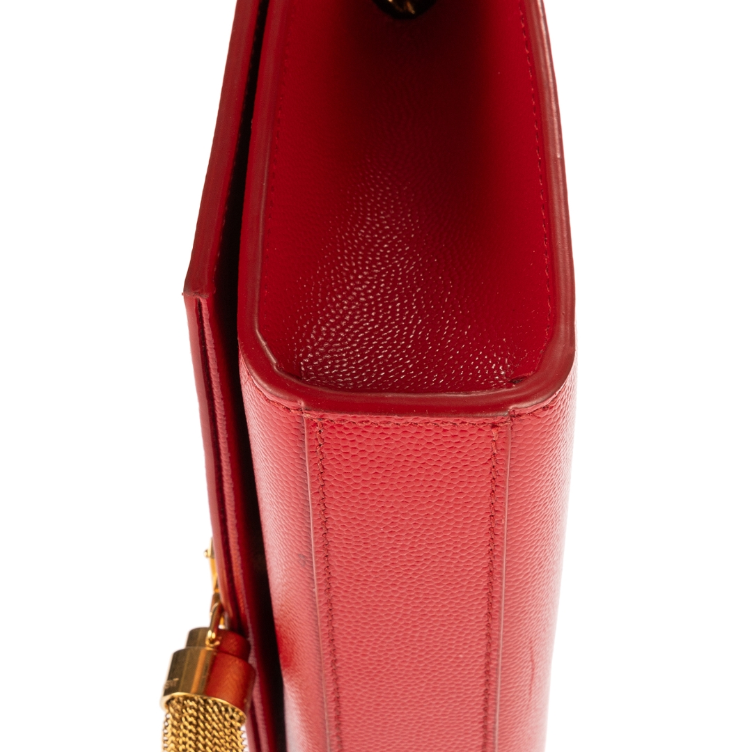 A vintage YSL red calf leather Kate Tassel bag with a certificate of authenticity, Approximately 13cm height, 20cm width.