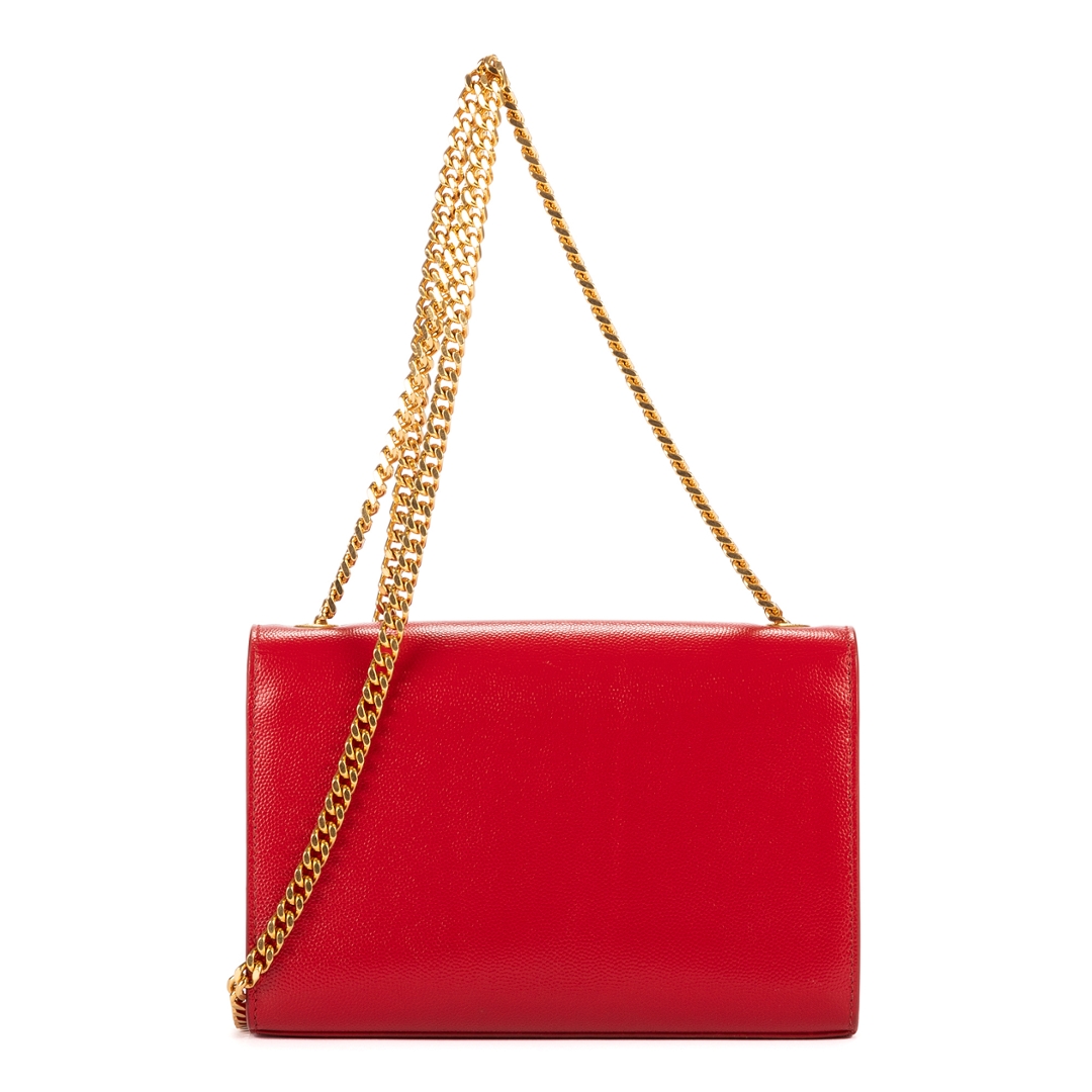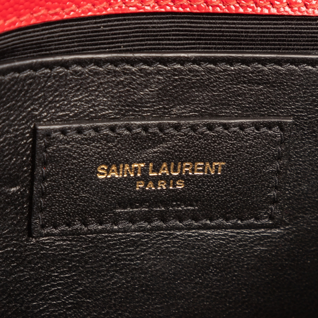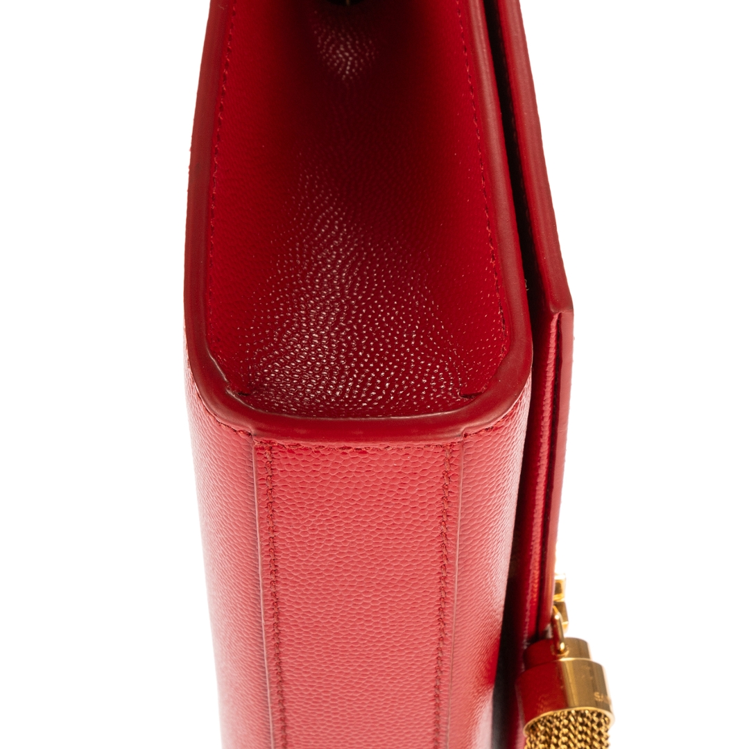 A vintage YSL red calf leather Kate Tassel bag with a certificate of authenticity, Approximately 13cm height, 20cm width.