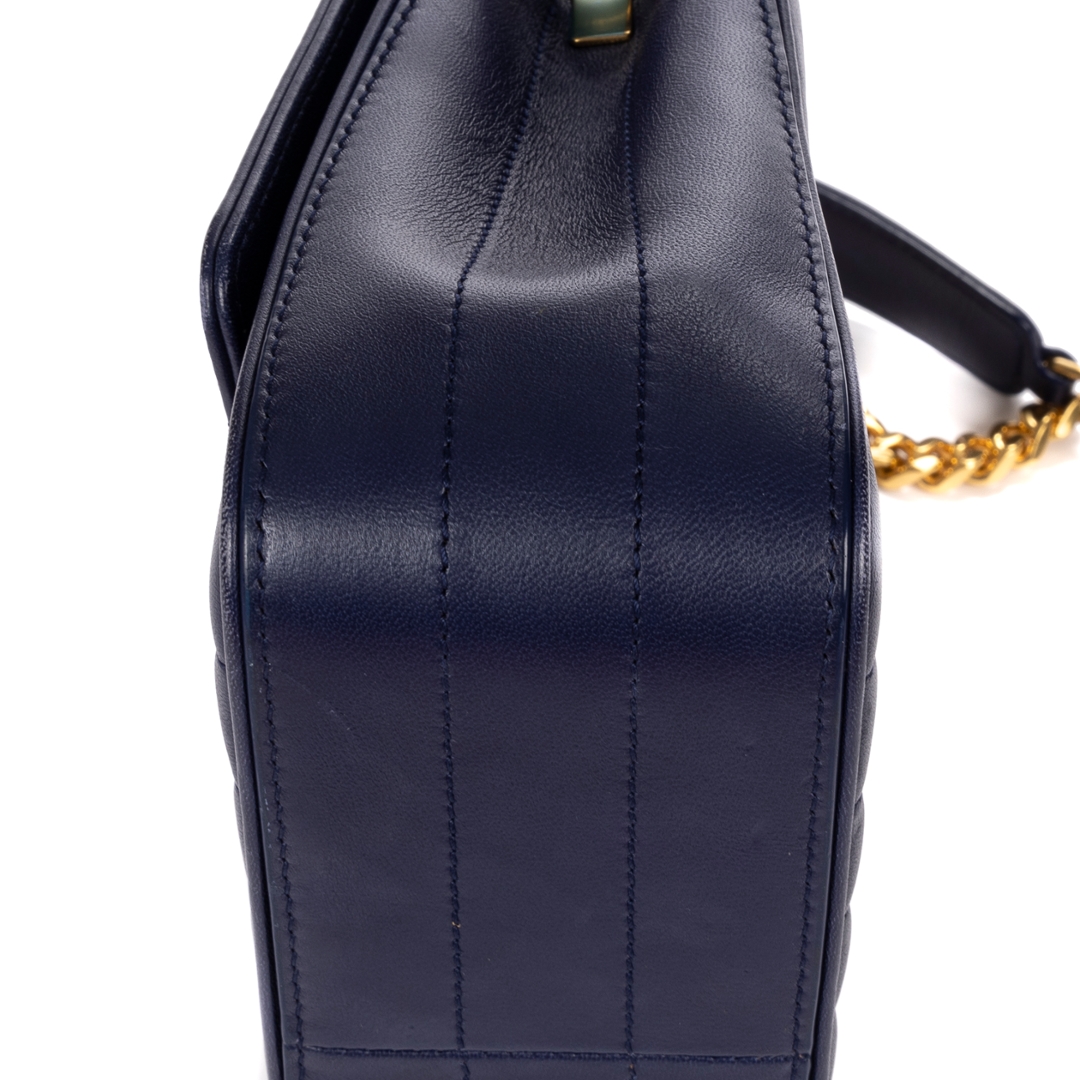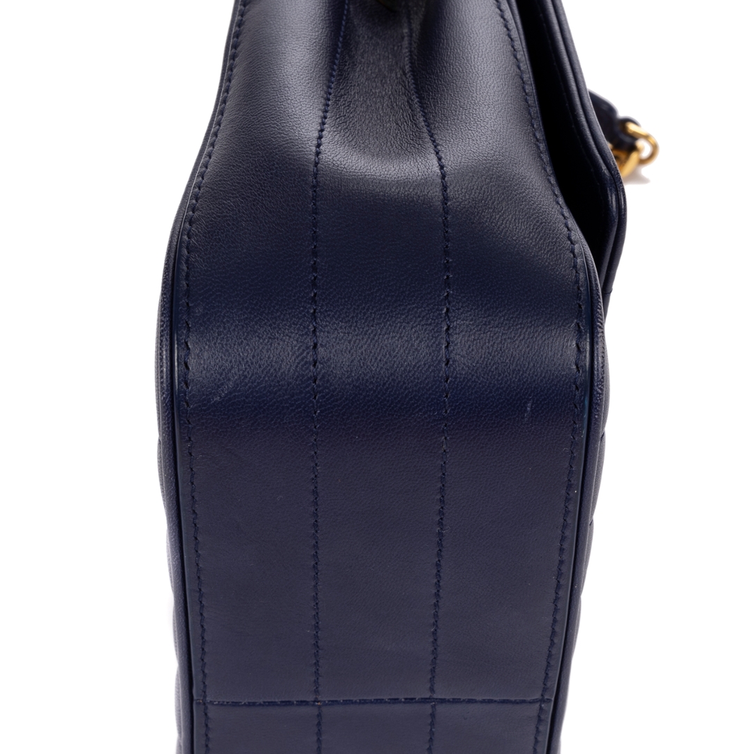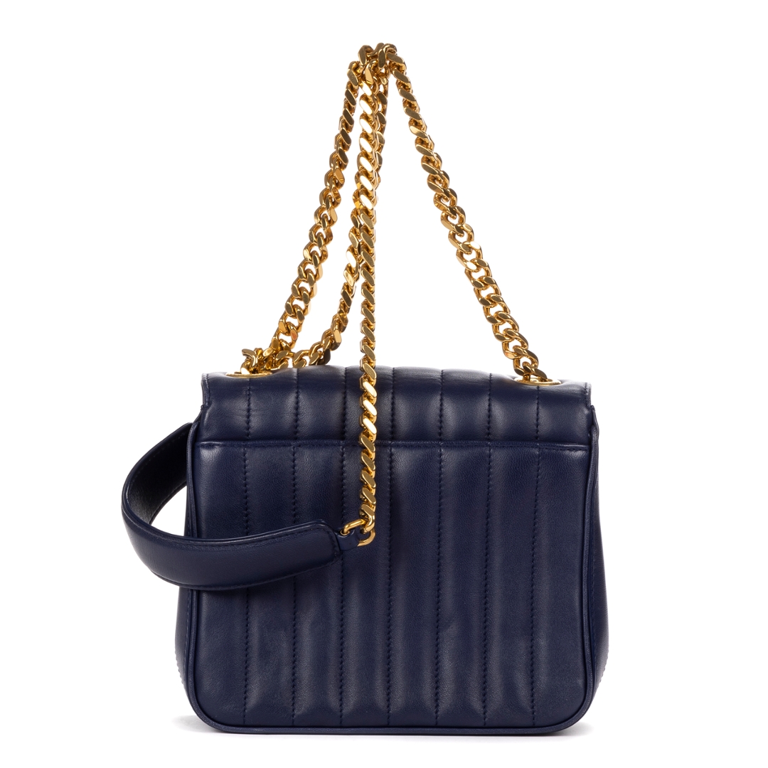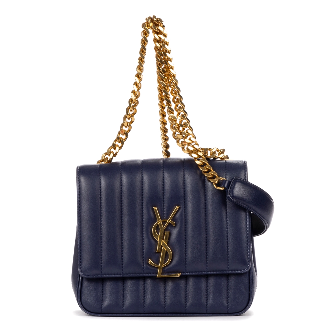 A vintage YSL dark blue calf leather Vicky Chain Flap Crossbody bag with a certificate of authenticity, Approximately 17cm height, 20cm width.
