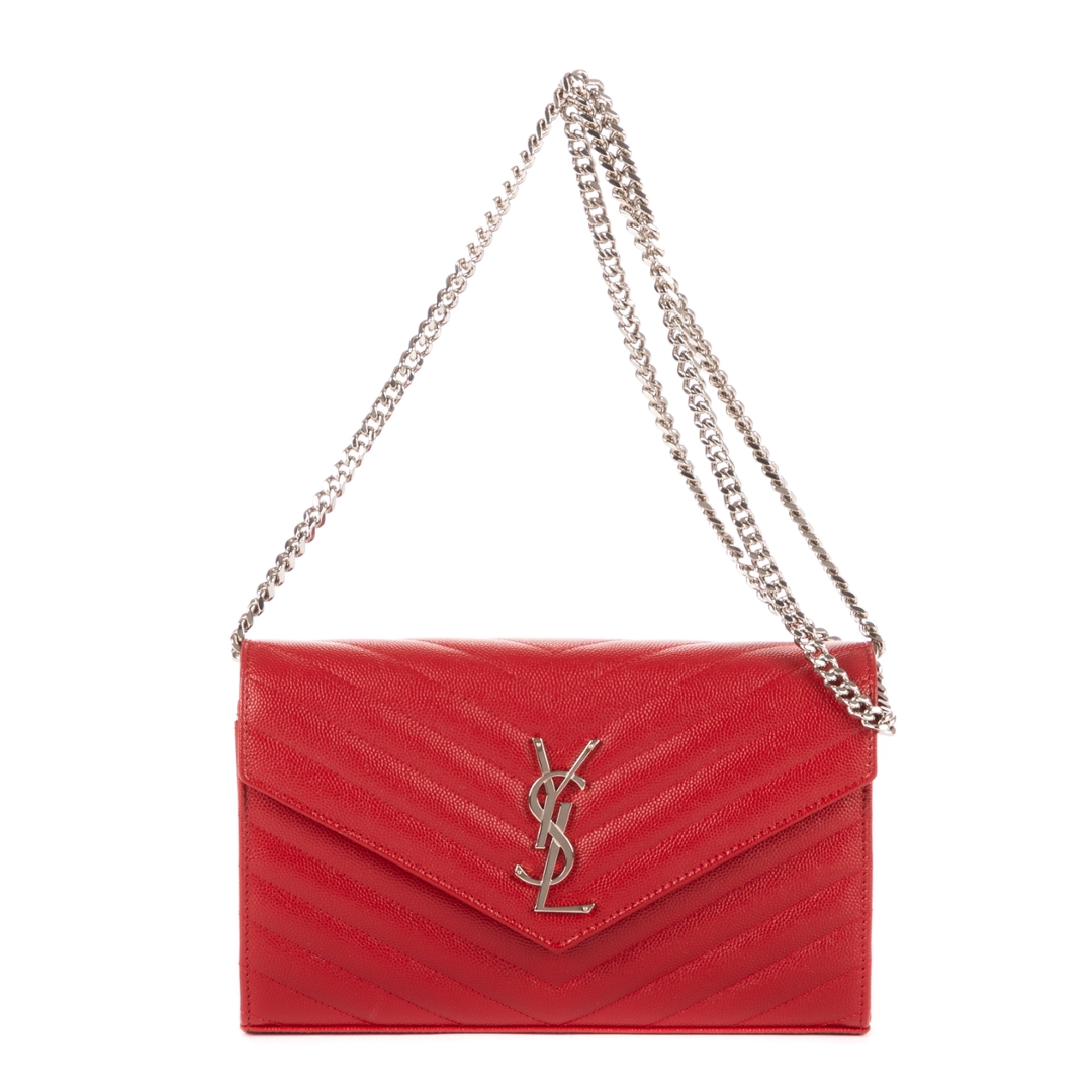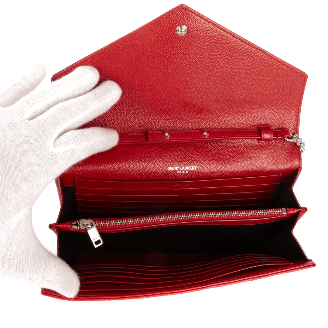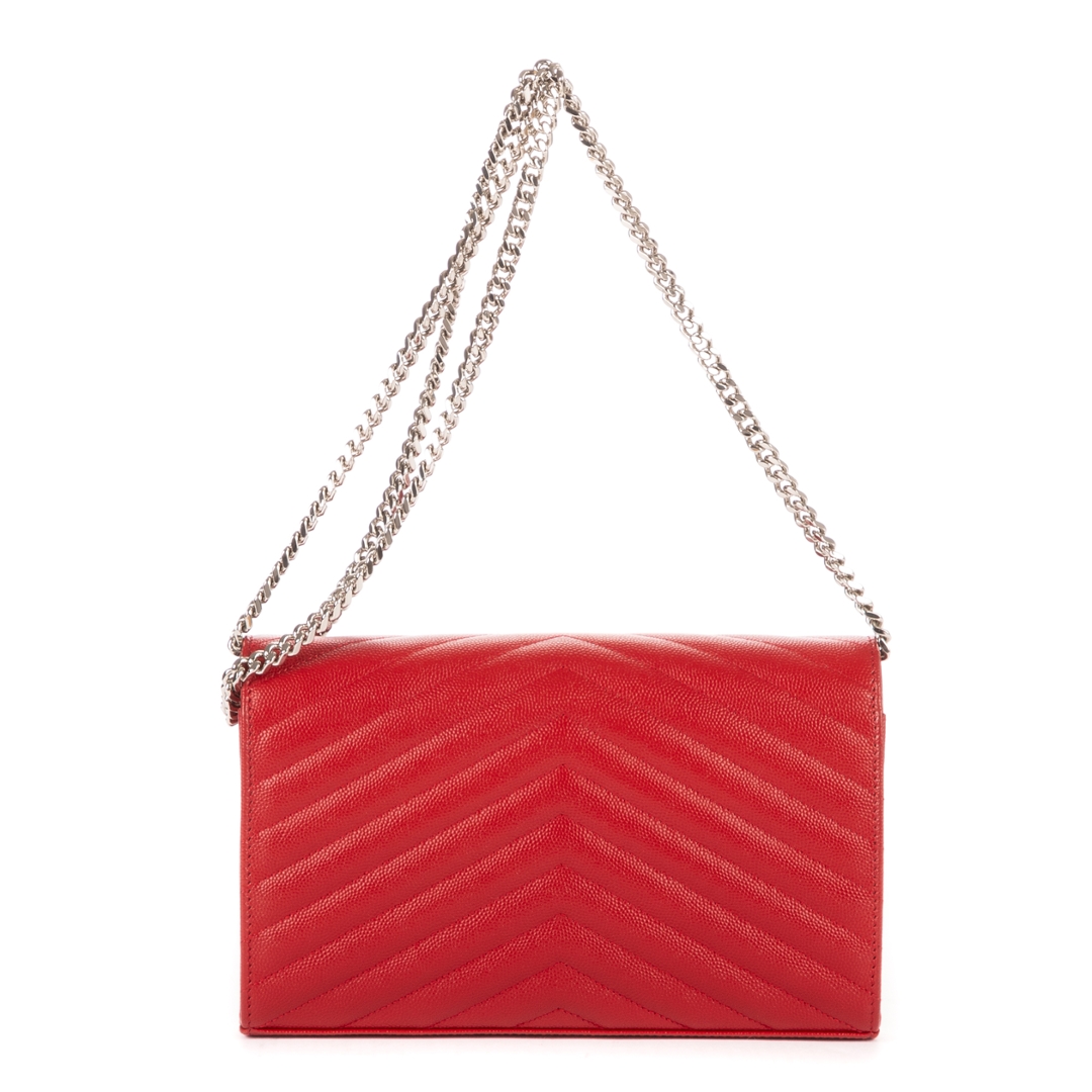 A vintage YSL red calf leather Wallet on Chain bag with a certificate of authenticity, Approximately 13cm height, 27cm width.